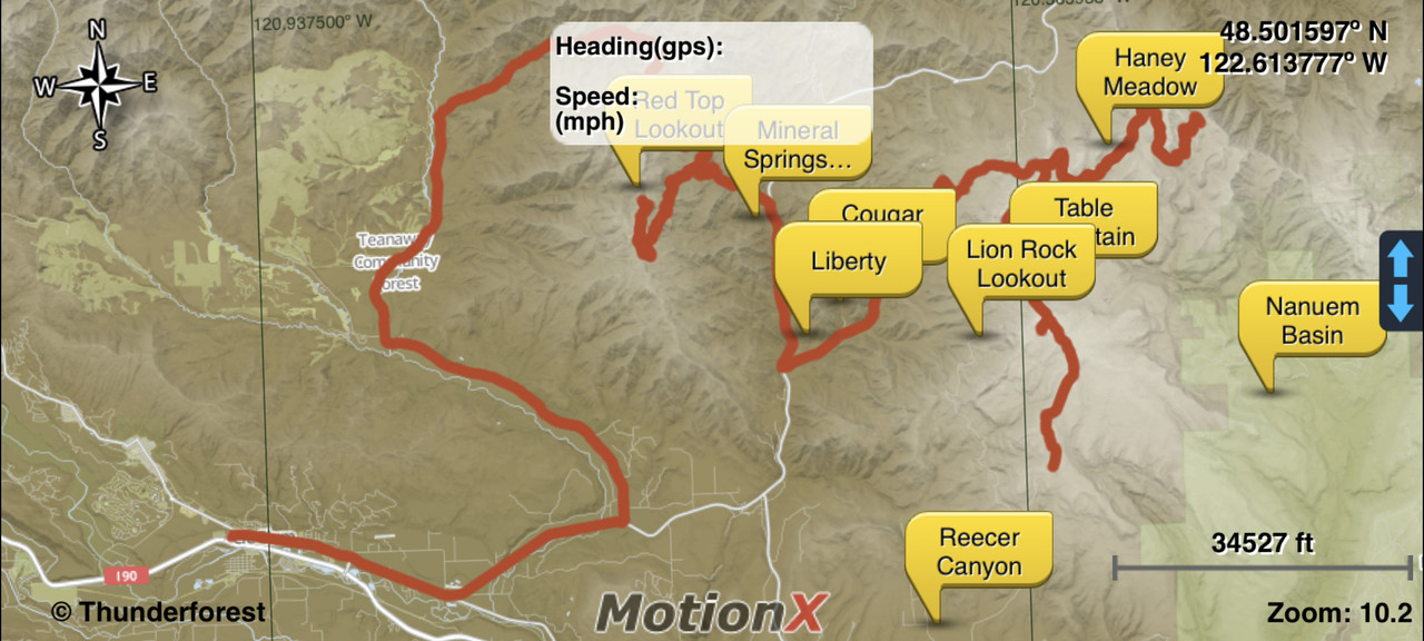 We all met up at an area Safeway to fuel up and headed out. The first stop would be Red Top Lookout. On the way up, the weather turned from being nice to a drizzle to rain to snow/rain mix to snow to snow with 20-30mph winds at the lookout. We were all enjoying the adverse weather but the lack of a view was mildly discouraging.