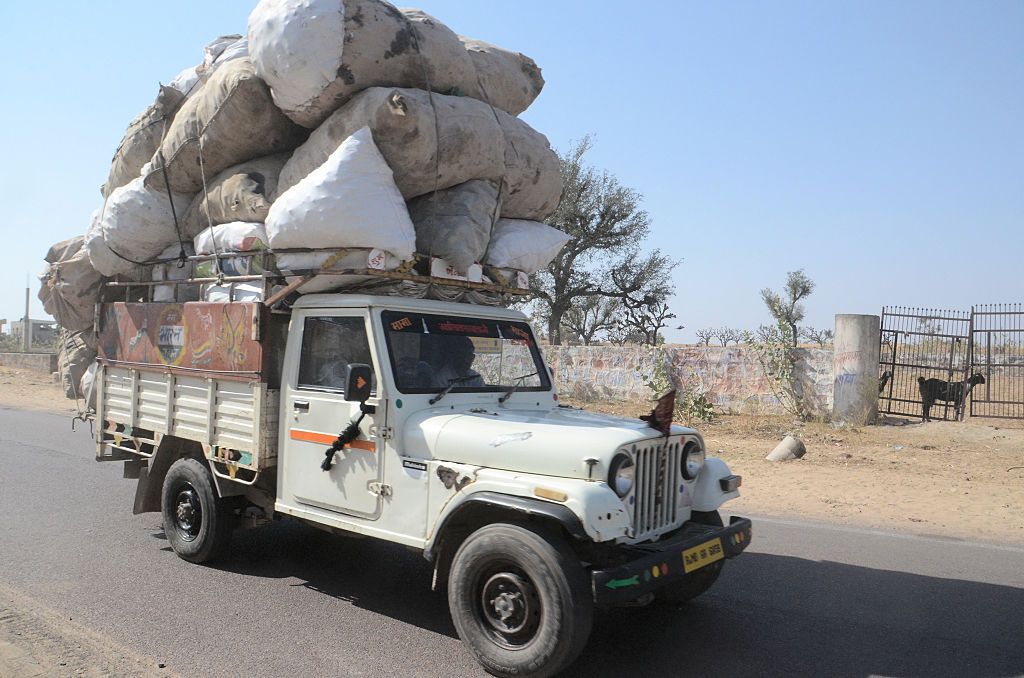 It's a Mahindra jeep carrying a load of straw and it's a common sight in Rajasthan. The loads overflow the bed and hangs down the sides as well as being over the cab.