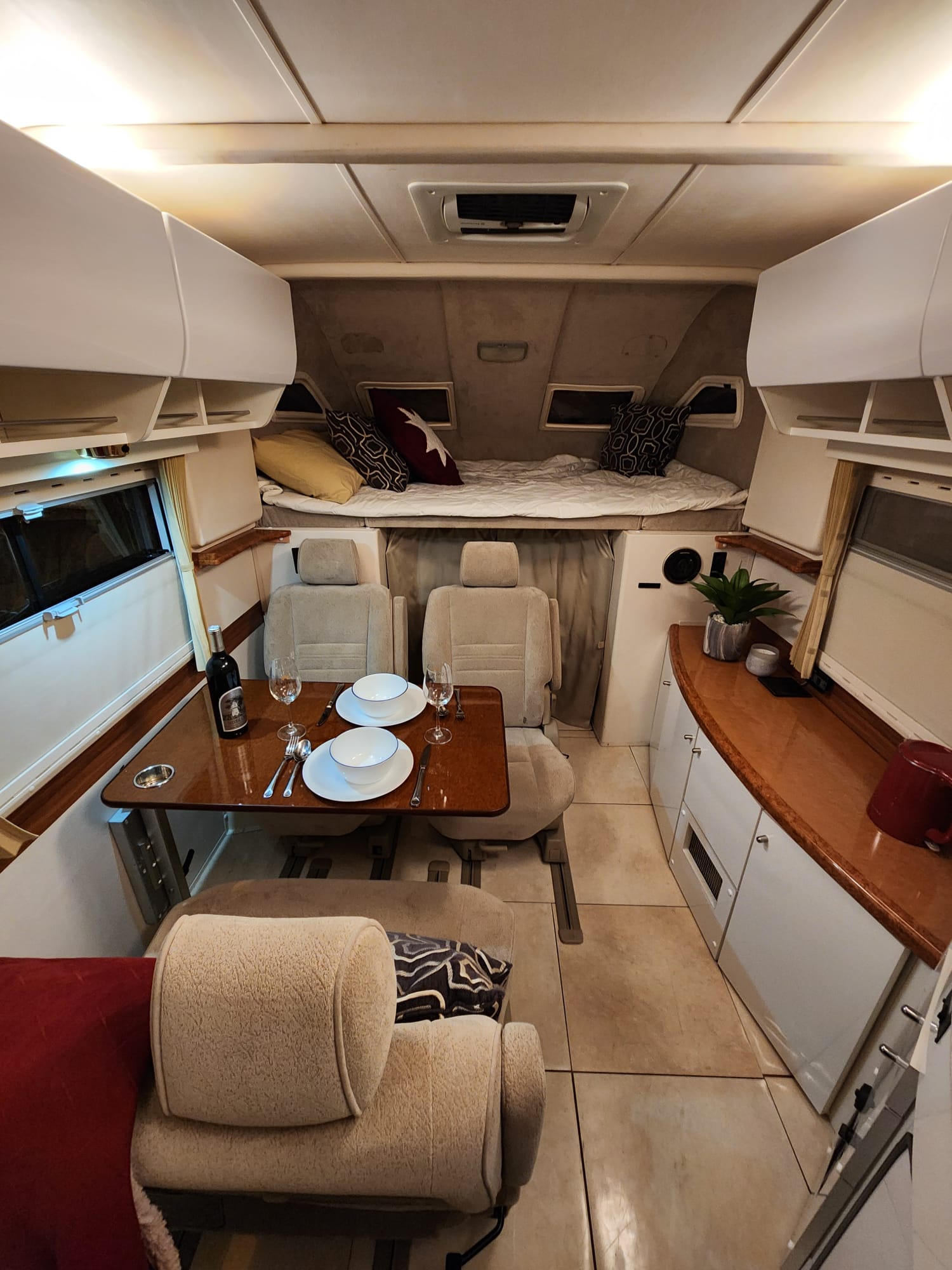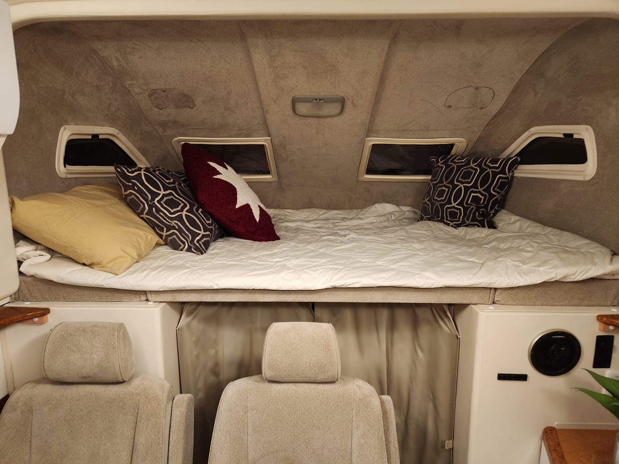 The full motorhome conversion included a queen size bed over the cab that also includes an extension piece that makes it close to king size. I’m 6’ and can sleep fully stretched out across the bed or sleep long ways with the extension in place (we removed the extension since there was enough room for the two of us). Can sleep 3 adults easily or possibly 2 adults and 2 small kids / dogs. At 6’, I can also walk around the entire living area without hitting my head on anything (about 6’2” headroom). There is a full kitchen with induction cooktop, sink, microwave and 12 volt 56L fridge. Has separate shower / toilet area. Toilet is a Thetford cassette toilet that can be easily dumped in any restroom. Fresh water tank is 13.5 gallons and grey water tank is 18.5 gallons. Motorhome was set up to be fully electric. We did however remove the electric water heater (it consumed too much battery) and replace with a tankless water heater that runs from a 5 gallon propane tank.