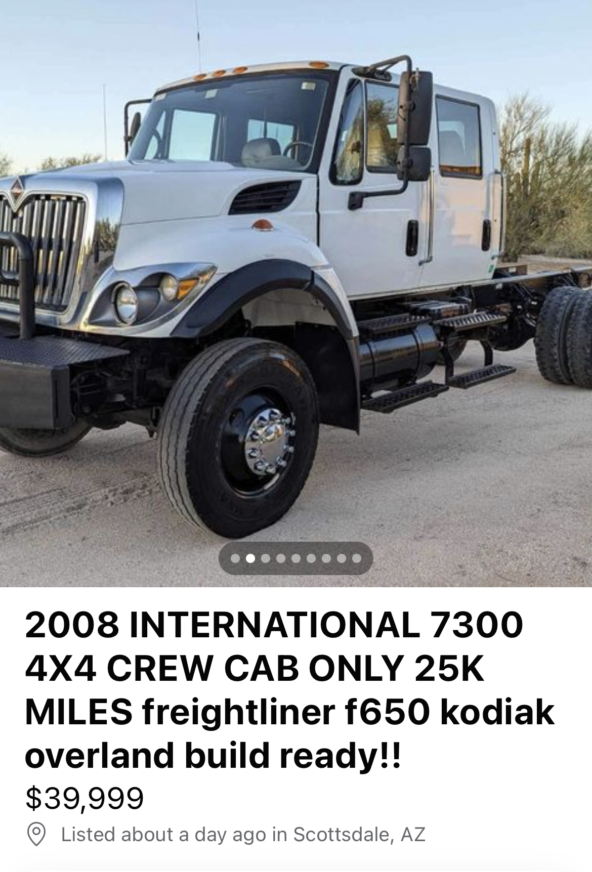 This is a 2008 International 7300 4x4 Crew Cab truck in great condition with a International DT466 and a easy to drive 6 speed manual transmission, deep tread tires, AC, push button 4 High, push button 4 low, push button 2 low, push button rear locking diff, air cab, air seats, air brakes, heated mirrors, and only 25k original miles. Truck is located in Scottsdale AZ. Delivery is available for around $2.00 a mile from 85260.