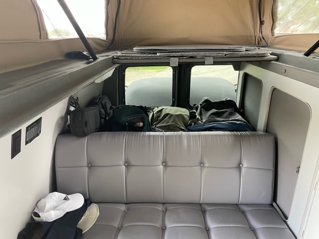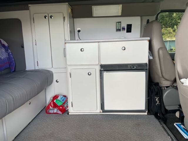 Van does not have a water tank or a propane tank. We have a portable induction cooktop and we just use water jugs for water. We also have a small electric heater that we use if it’s cold and we are at a campground with electric. The van has two group 27 AGM 100 AH house batteries replaced about a year and a half ago and it has a 2000 watt inverter for 120VAC power for the cooktop and computers, etc.