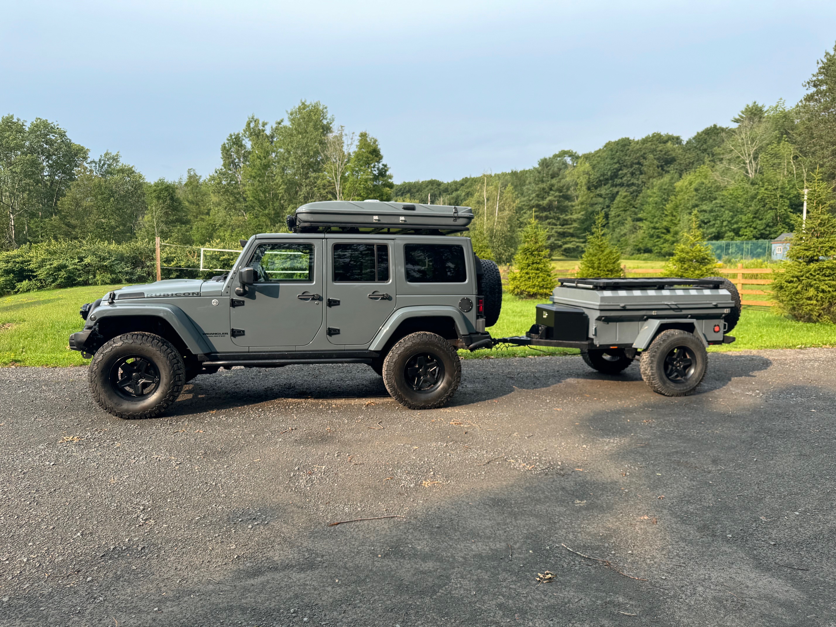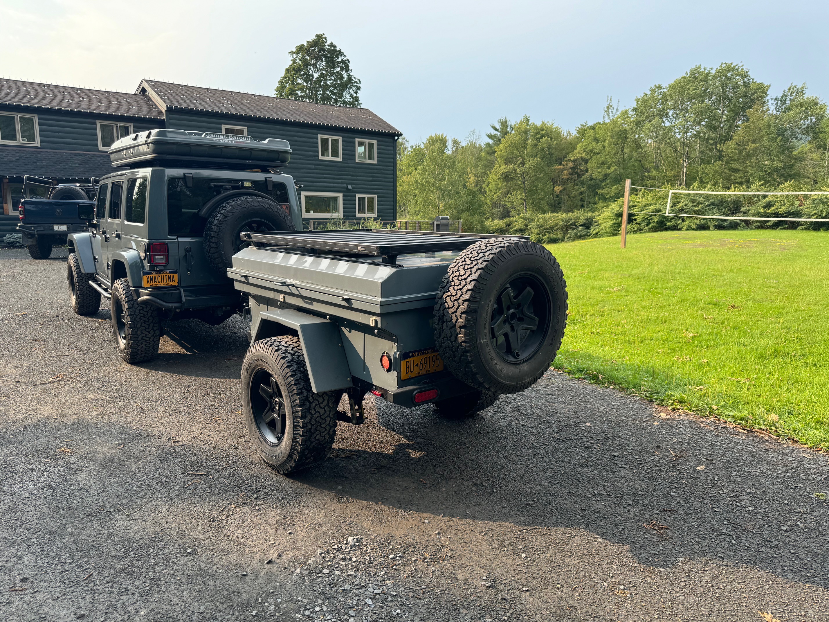 I built the trailer by modifying a military 1966 Steven’s M-416 trailer. An insane amount of time went into designing and fabricating it, including extending the tongue and reinforcing the chassis. The entire trailer was taken fully apart, and the tub and lid were sandblasted, galvanized, and then powder coated in the matching Anvil color. The interior of the tub is powder coated in textured black. The chassis was stripped to bare metal and was thoroughly prepped before applying 2 coats of POR-15 Rust Inhibitor and 1 cost of POR-15 UV-resistant Top Coat. The tongue was extended roughly 36” for in order to fit a tongue box, Jerry can holder, aHydraulic Jack, and a Lock-N-Roll hitch. This extension also helped greatly with the maneuverability and it is extremely easy to reverse with. The axle is a new Dexter axle with trailer brakes, as well new the leaf springs, bushings, grade-8 zinc-coated hardware, and tongue box. Inside the tongue box, you have a deep-cycle battery connected to an S-pod with 6 Aux switches, as well as a water pump connected to the Front Runner Water tanks, to have pressurized water on demand. A new heavy-duty custom trailer bumper was fabricated to match the trailer lid design and it features recessed LED lights. I reused my original Mopar tire carrier from my jeep and modified it to fit the trailer and added the AEV third brake light kit. The trailer tracks beautifully and I took it on a 19k mile round trip across the country and never once had an issue. The Jeep pulls it with ease and it gets an insane amount of attention!