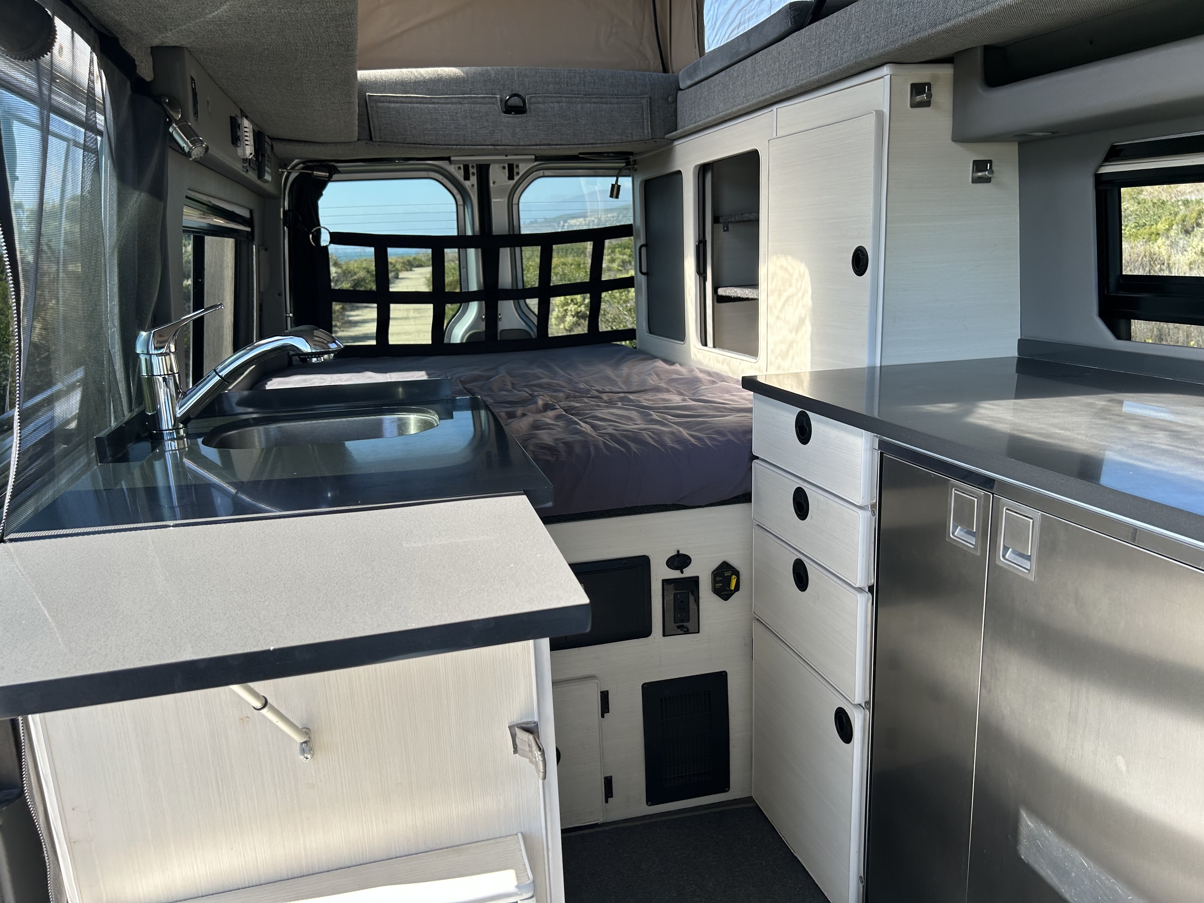 --Flip-up tables on cabinets for extra counter space; outside flip-down table with cabinet access from outside van