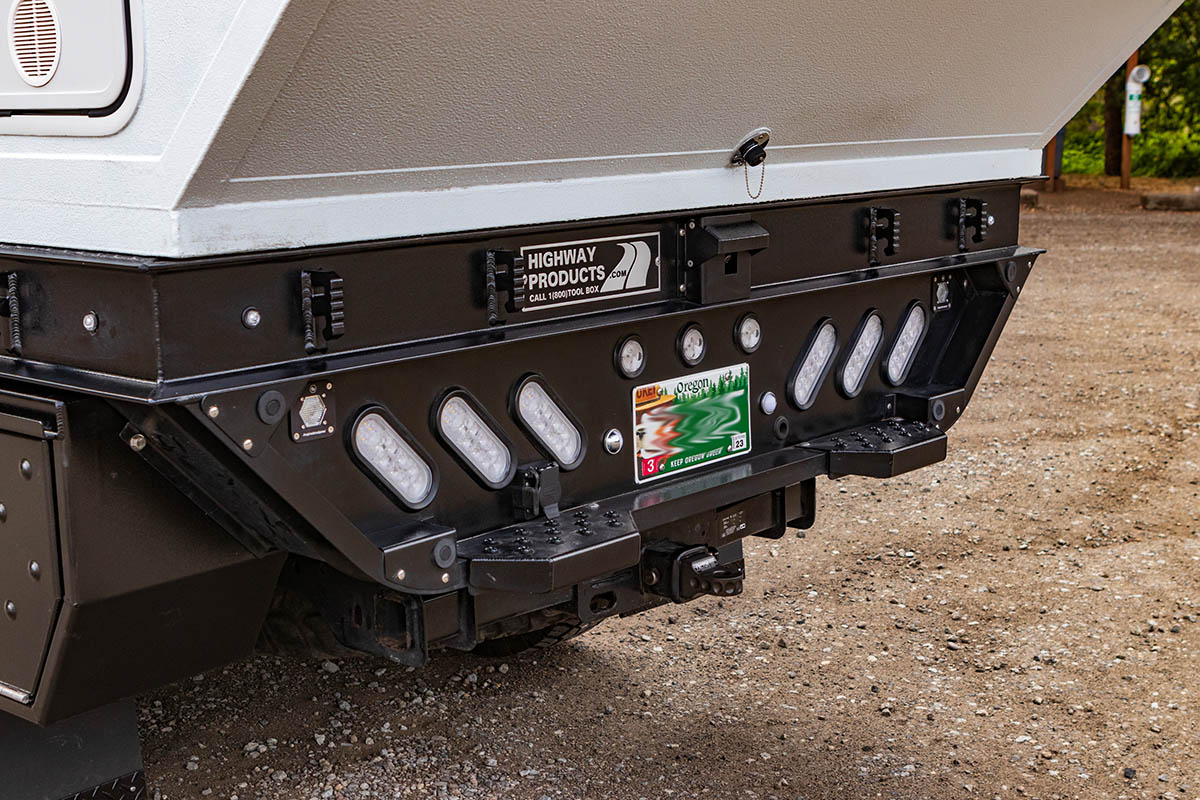 -Crossframe/tunnel box(84x40x13). Custom fuel filler in driver side crossframe box, 2qty circle vents (to allow fuel storage inside box), 2 levels of 4qty adjustable/removable shelves and 8strips of L-track throughout, LED lights that illuminate when you open driver or pass box doors.
