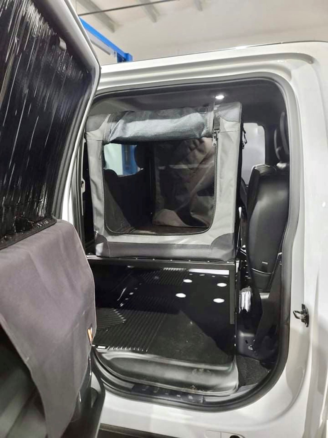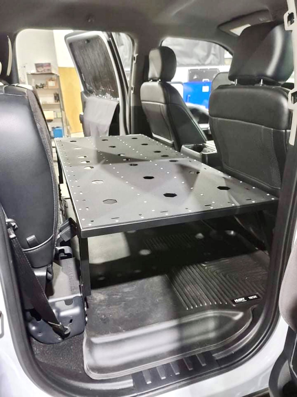-Fully custom 2nd row dog/storage platform using factory interior attachment points, still allows for maximum storage underneath. Also has provision to hold FrontRunner large stainless camp table. Now revised to allow "40" seat in RR to be used once this "40" section of the seat platform is removed.