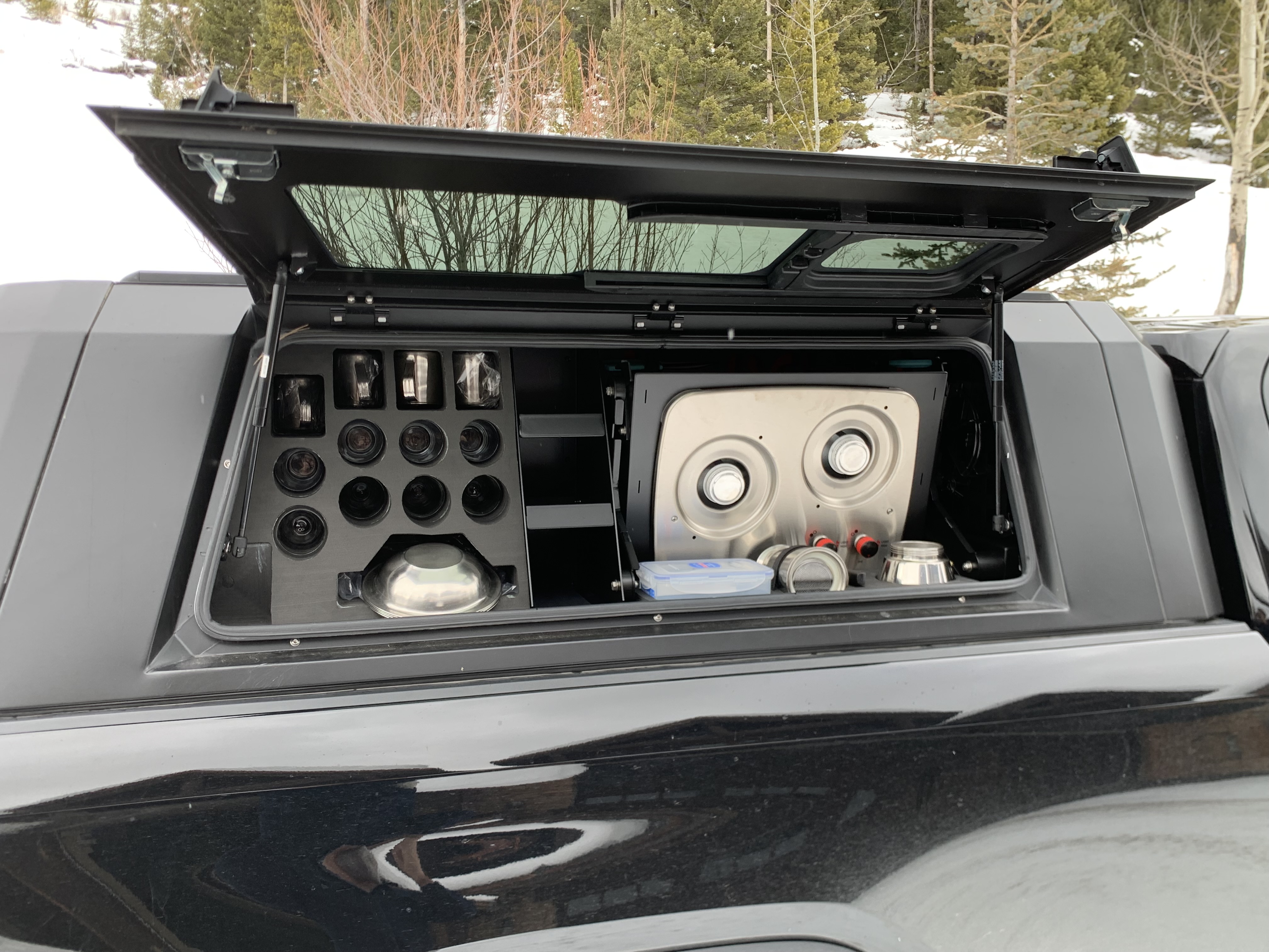 SmartCap System: SmartCap Evo Sport Canopy with their Camp Kitchen & Stowaway Table. Including the Hest Dually Mattress which unfolded, fits nicely between the wheel wells and gives you 78” x 50” of sleeping space and lays on top of the BedRug. I will also throw in Rhino Bars & Feet (Fridge pictured not included.)