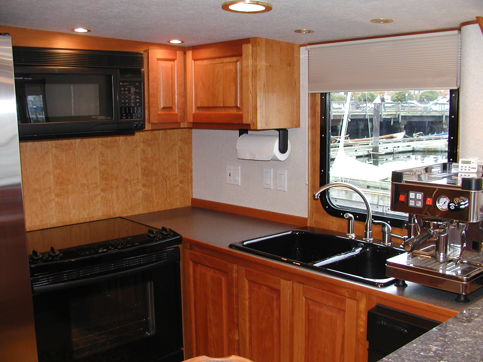Inside she has a full cherry interior with three staterooms. The main deck has the main stateroom which doubles as an office for remote workers, private head (bath), and cedar-lined closet. The galley is nicer than most homes with inductive cook top, double door stainless fridge, dishwasher, and trash compactor (trash can add up during long voyages). We'll even throw in a single group espresso machine! Below decks are two more staterooms, one with a bunk bed and the other with a full. A head with front loading laundry machines keeps everyone smelling as they should. Also below decks is the engine room, which is full standing height, and a lazarette area with lots of storage for bikes and other gear.