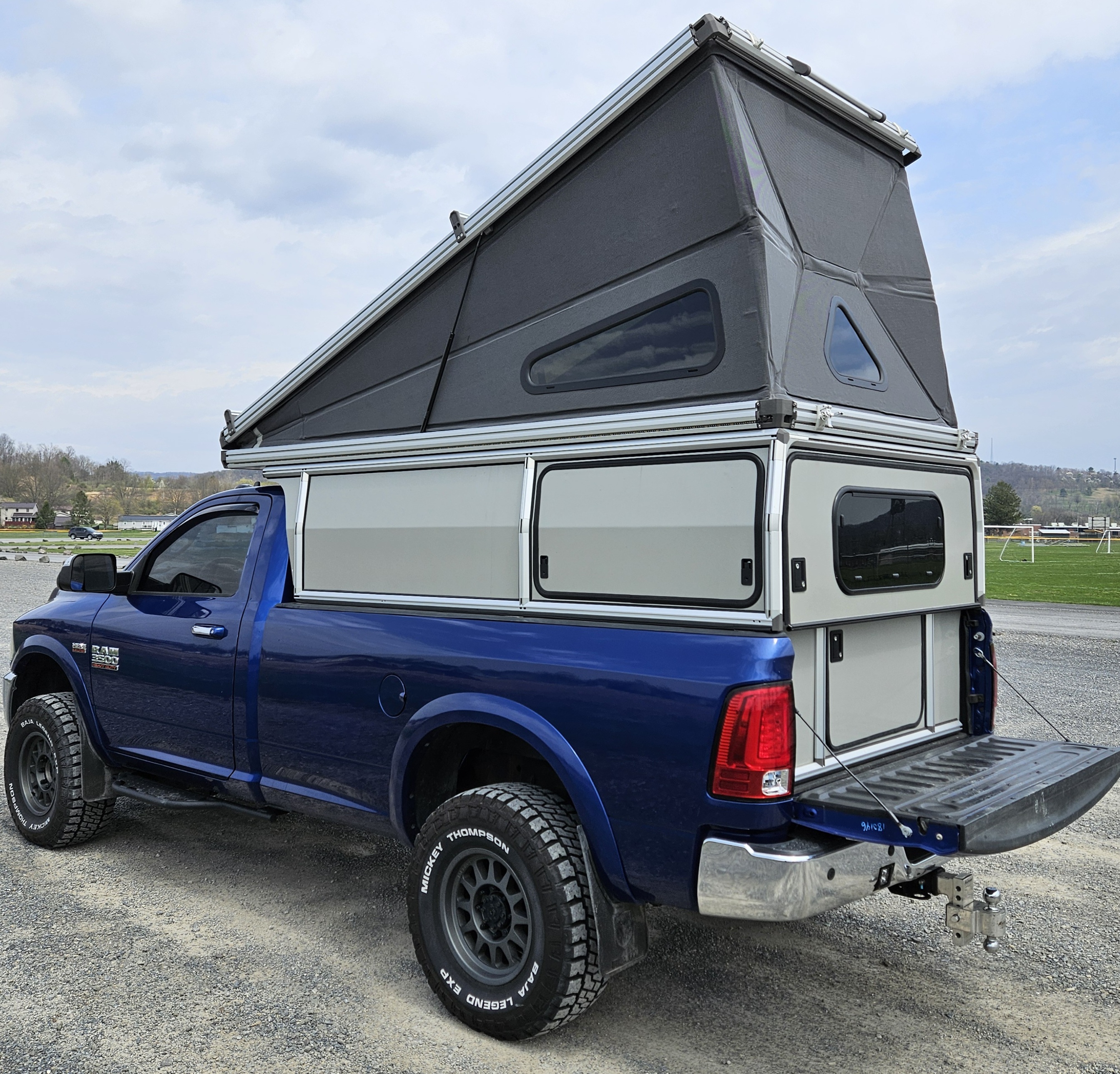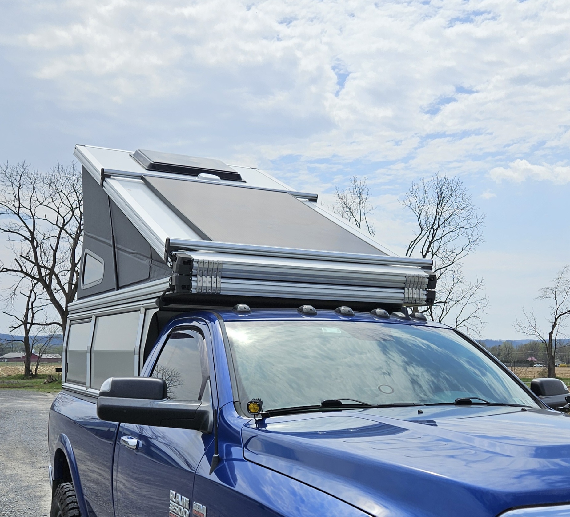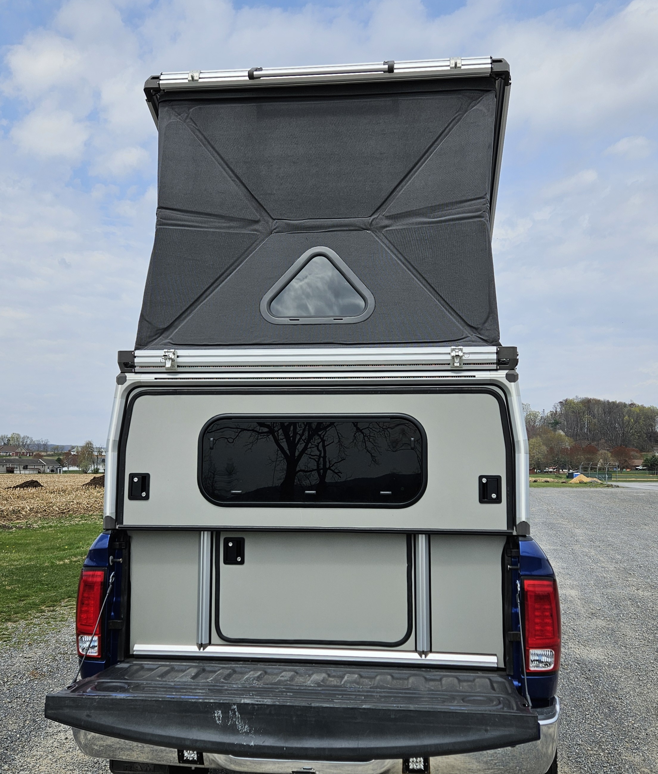 I know this fits Ram 8 foot from 2010 to current and it fits current Ford Superduties but if anyone is interested I will take exact measurements before hand. I have overhead cranes that can easily swap this out. Aluminum Wedge style pop up. Queen sized bed, North/South sleeping. 40" of space in front of the bed but the bed frame does lift. I have awning brackets will go with it. Aluminum extrusion frame with pop open rear panels. Rear window option that opens, rear dutch door option, nice for keeping dogs in. Fully lockable side doors and hatch. The sleeper has insulated panels and folds up, no vinyl to take care of and clean constantly. The bed lifts up to make this a huge space. Dimmable exterior lighting can switched between red or white light. Maxxair mushroom fan and a skylight that opens up with two postions. This has a front shelf on it, I had my battery sitting there and luggage with a fridge underneath. This has the roof rack option with a 400 watt solar panel mounted flush with the roof rack panels. The control panel plugs in with a SAE 12 volt plug and can powered with the Ecoflow River 2 battery that's included or by plugging in to the truck battery. It has the inside/outside light switches, dimmers, fan switch, and a 12 volt plug. The construction is very sturdy but this is a shell. It will need built out to your liking. It works as is if you just want to throw stuff in the bed like I did. I will include any of the 80/20 stuff I have, mounts, bolts, rubber seals, spare latches, awning brackets. This 80/20 construction is easily modified and everything is available from popular websites.