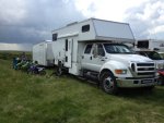First built on a F-700 4x4 chassis with 33 000 pound GVW. It had a 5.9 Cummins and it was fine with just the camper. When I hooked the trailer on, which we haul up to 4 bikes and a Jeep in it really sucked it down on hills, crossing the divide with that configuration wasn't going to fly. So I bought a mint F-650 crew cab with a C7 and an Allison 5 speed, the 650 has a 26 000 pound GVW, I swapped everything over in a weekend, and much happier. It might get a EZ Trac front drive axle this winter but the reality is we have used the shorts off of this thing for the last 2 months, drove through a few meadows, and had no issues, there is nothing that has stopped us yet and all of our camping is remote (we race xc and hs). There is only slightly more than 3000 pounds on each tire, which is way under the load rating of a 11R22.5 so the footprint is pretty light. As stated the rig comes in at 18 959 lbs with 4 on board, full fuel, 150 gallons water, full propane. And....it's pretty sexy inside!