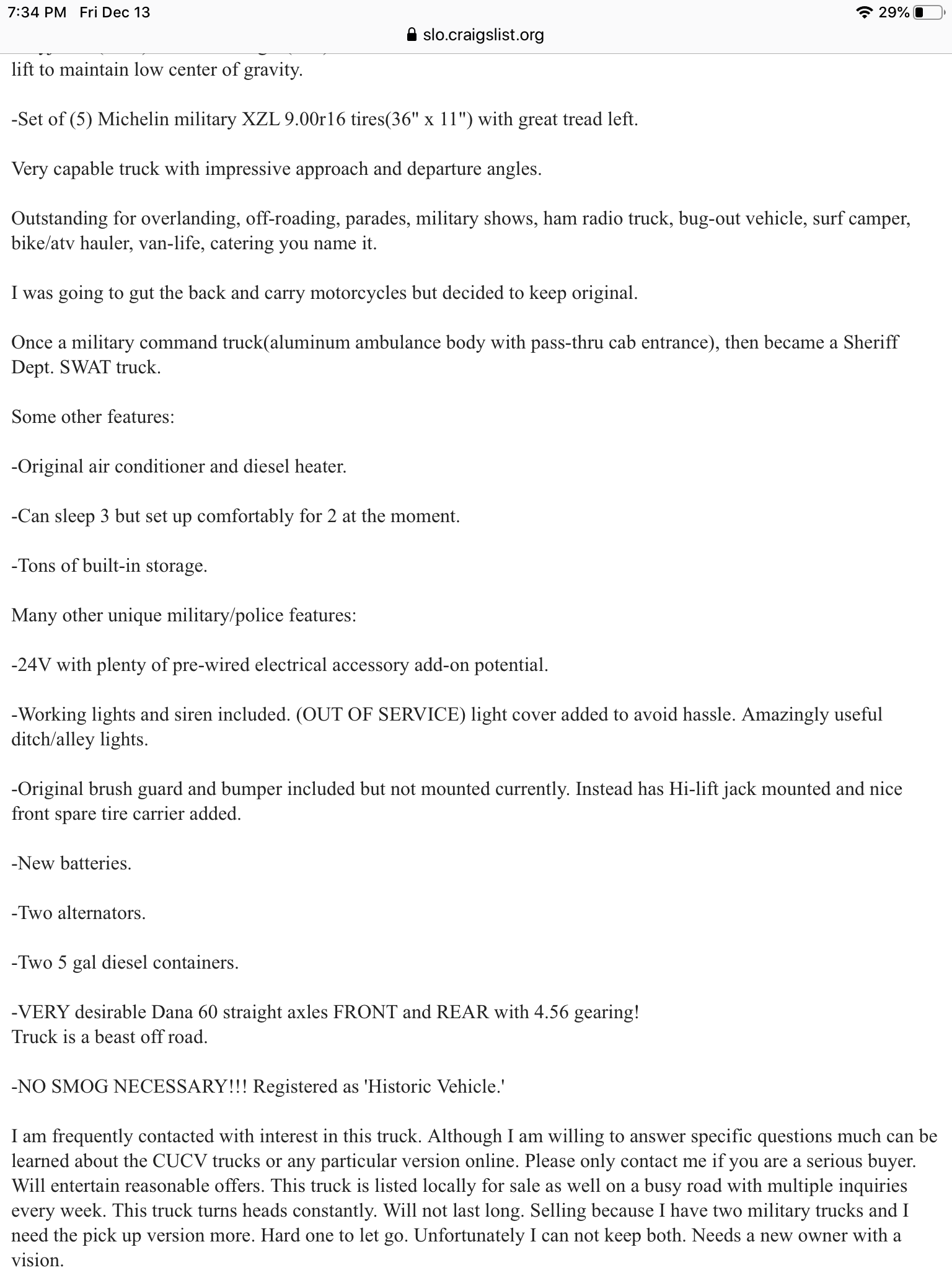 I sold mine with a new paint job and restored to military specs to a museum for $4k 3 years ago. While it didn't have any of the goodies that's been added to this one it was still an extremely nice example. But when it all comes down to it, this is still a 40 year old vehicle that was likely used/abused while in service and would take a ton of money to make a reliable, comfortable, overlanding vehicle.