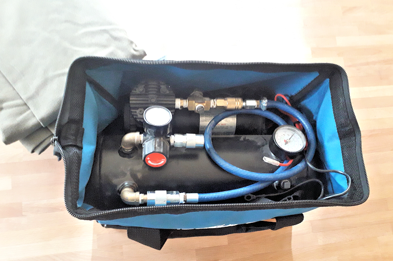 Everything almost fit except the bag won't zip closed, the bag is a little too low. Also the sides of the bag are high enough that air flow to cool the compressor would be restricted, so a different bag design would be required to provide cooling air flow. I'm thinking of designing a bag that would hold the compressor (but maybe not the tank) and have separate pockets for the air hose and perhaps for the power cord, and maybe some pockets for some air accessories. The bag would have a hard bottom that the compressor and some wiring could mount to, and a flap on the top that would open enough to provide unrestricted airflow to cool the compressor.