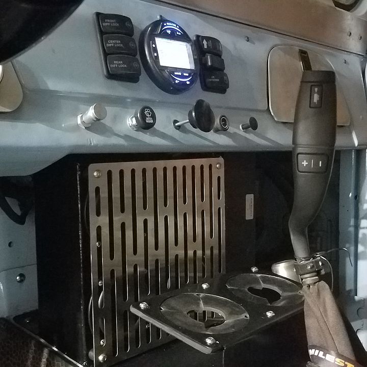 I also finally built a small (4) speaker box and cup holder combo that fits on top of the tunnel. This has sound deadening material on the inside and is poly filled with a laser cut stainless grill that is suppose to look reminiscent of some of the stock 40-series heater boxes. This little box sounds quite good with the Dual audio marine stereo and allows me to manage quite a few audio sources. I now have am/fm radio with weather bands, an mp3 player from a flash drive, bluetooth for my phone for nav, and was also able to feed the audio from the ham radio into the bigger speakers.