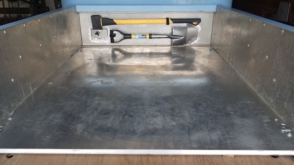 I also ended up adding a small pioneer tool rack, with a (small) shovel and axe, onto the front bed wall panel. The original 'temporary' plywood bed floor was also replaced with an aluminum unit. The aluminum version was built with thin sheets and 5/8 x 1.5 solid stringers/edges that was completely held together with 3M panel bond adhesive.