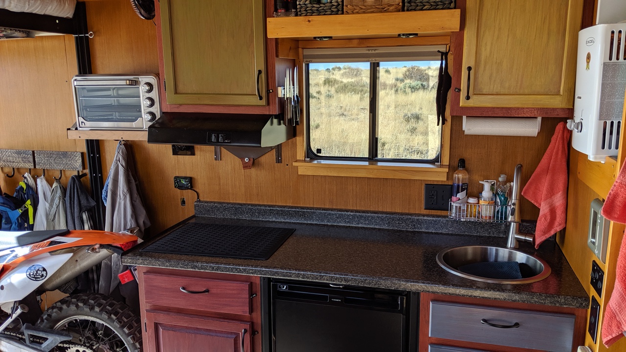 Not found 1 that can carry 5 pr of skis, dirt bike and 2 mtn bikes. Has a usable shower and sink at 0 degrees, plus all these amenities.
