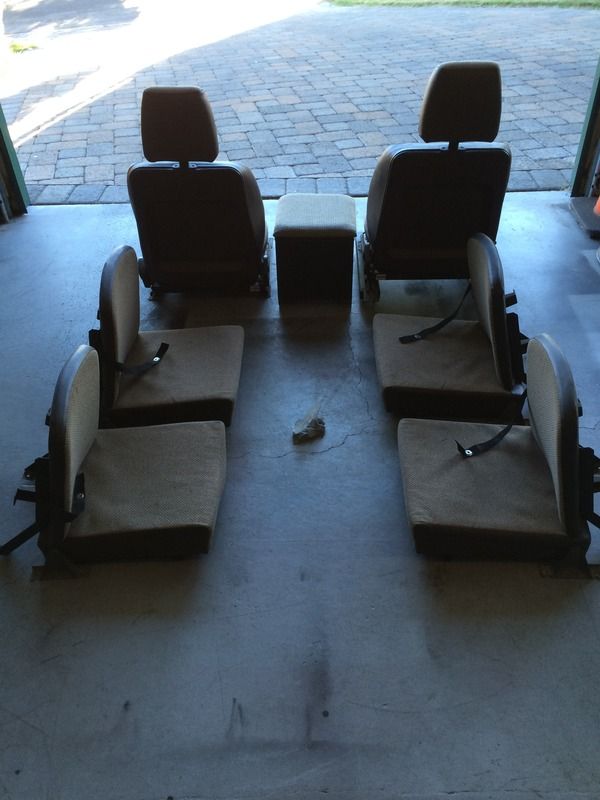 Two front seats, locking centre console with maglite mounts on front, cup holder insert, and Commander sized 1911 holster inside, plus 4 rear jump seats from my RHD '85 Ninety SW. The drivers seat is tired & doesn't exactly match the others (it's bloody close). Also has box section steel welded onto the bottom to give it a lift. and there is some damage on the bottom of the back of the passenger seat but overall useable condition. Jump seats are in great shape. Minor surface rust here & there, but all the retainer straps are there, and they don't have any rips or tears.