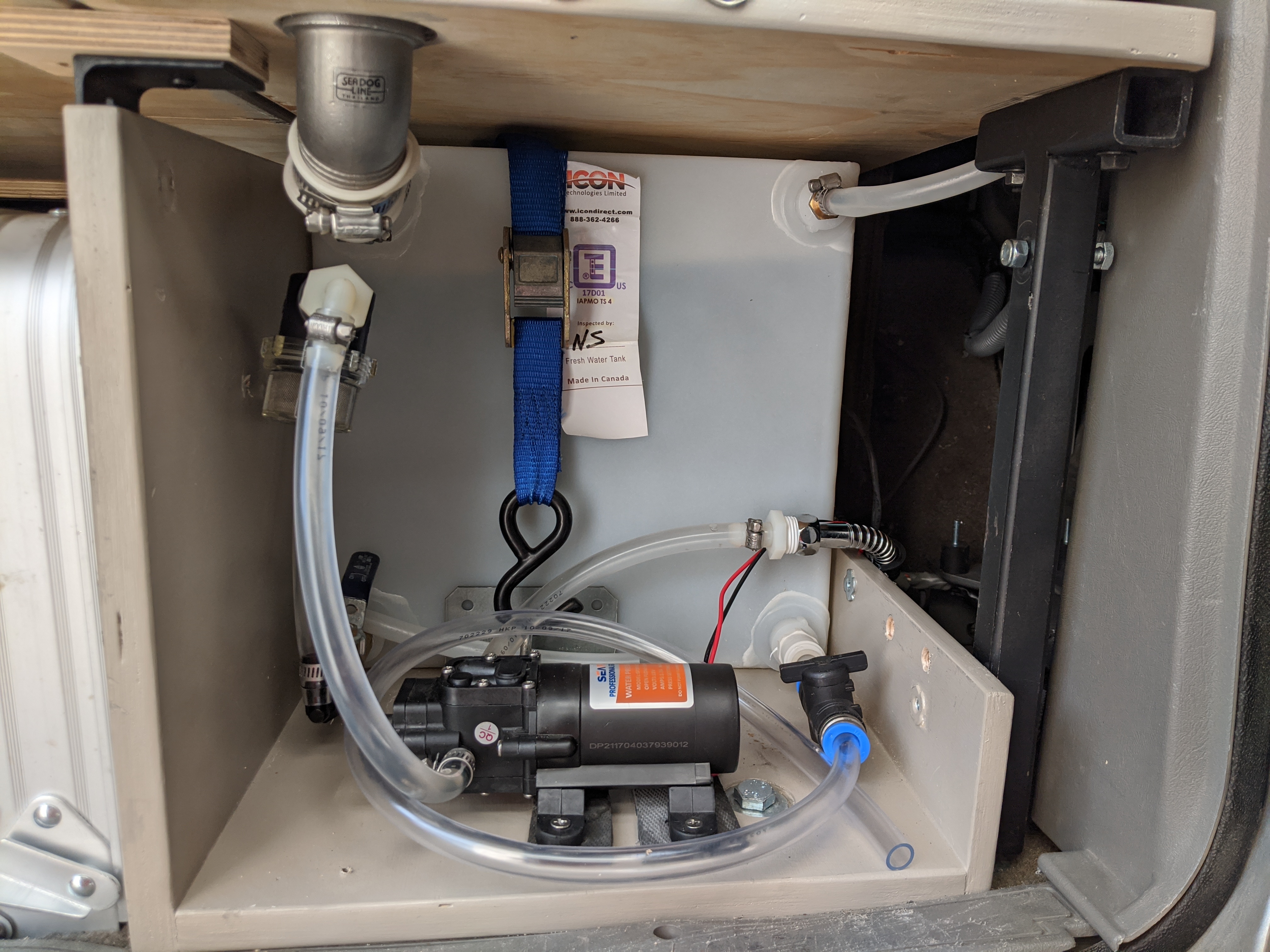 Due to some other work going on near the rear of the van, I finally got motivated to do a little clean-up on the plumbing in the water cabinet. I flipped the water pump to have a cleaner orientation for the output of the strainer to the pump input, and generally tidied up some of the connections. This also gives a better view of the deck-fill connection and cam-strap that holds the tank down. Upcoming work will take advantage of having cleaned up that access area on the right-hand side.