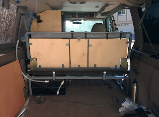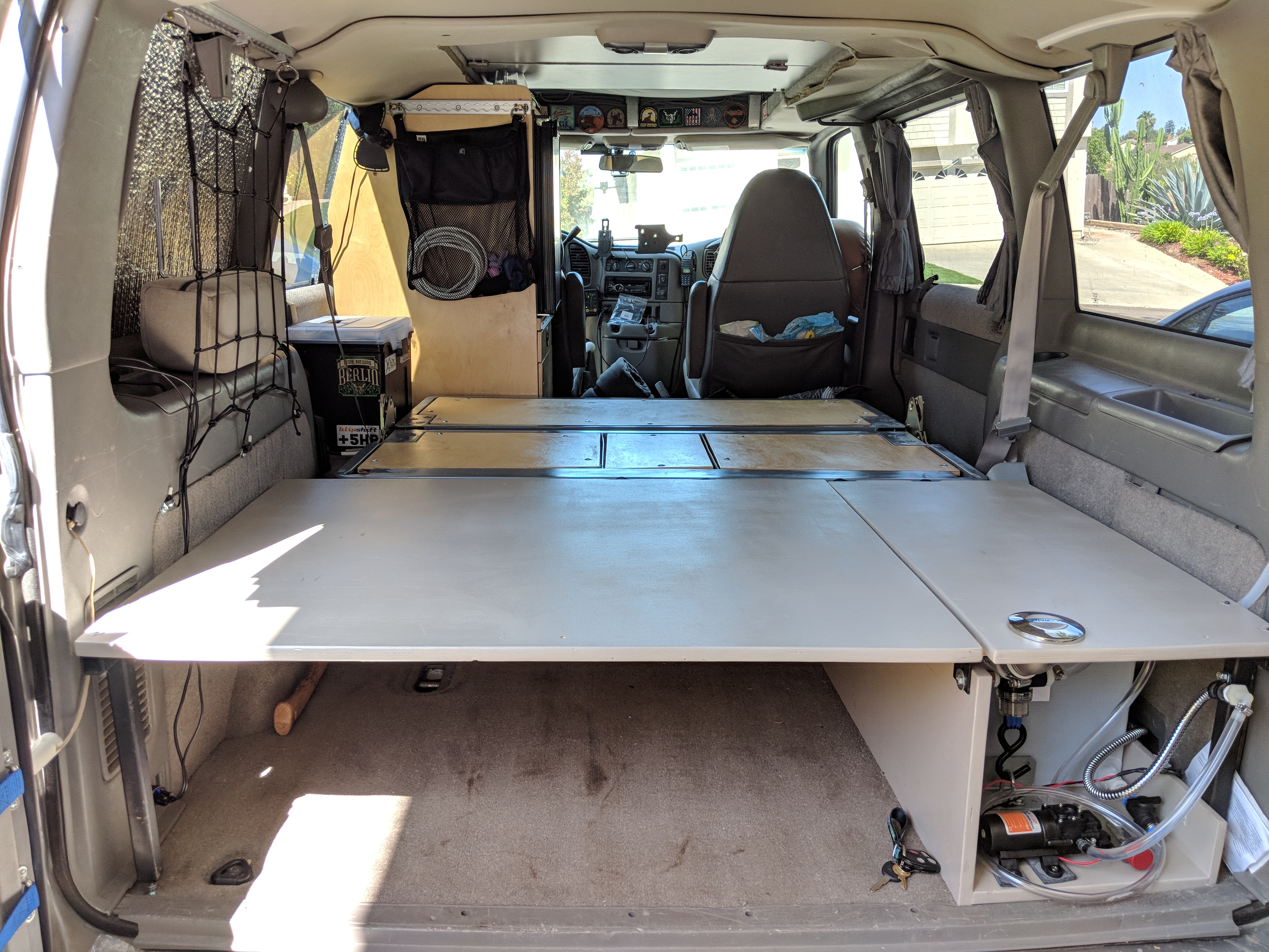 custom-sewn luggage I made, with a bit left over for drawer that allowed me to keep the tools safely stowed. The drawer latches to the sofa bed frame to keep it from sliding aft in the rare condition when I don't have the rear cargo space filled with stuff.