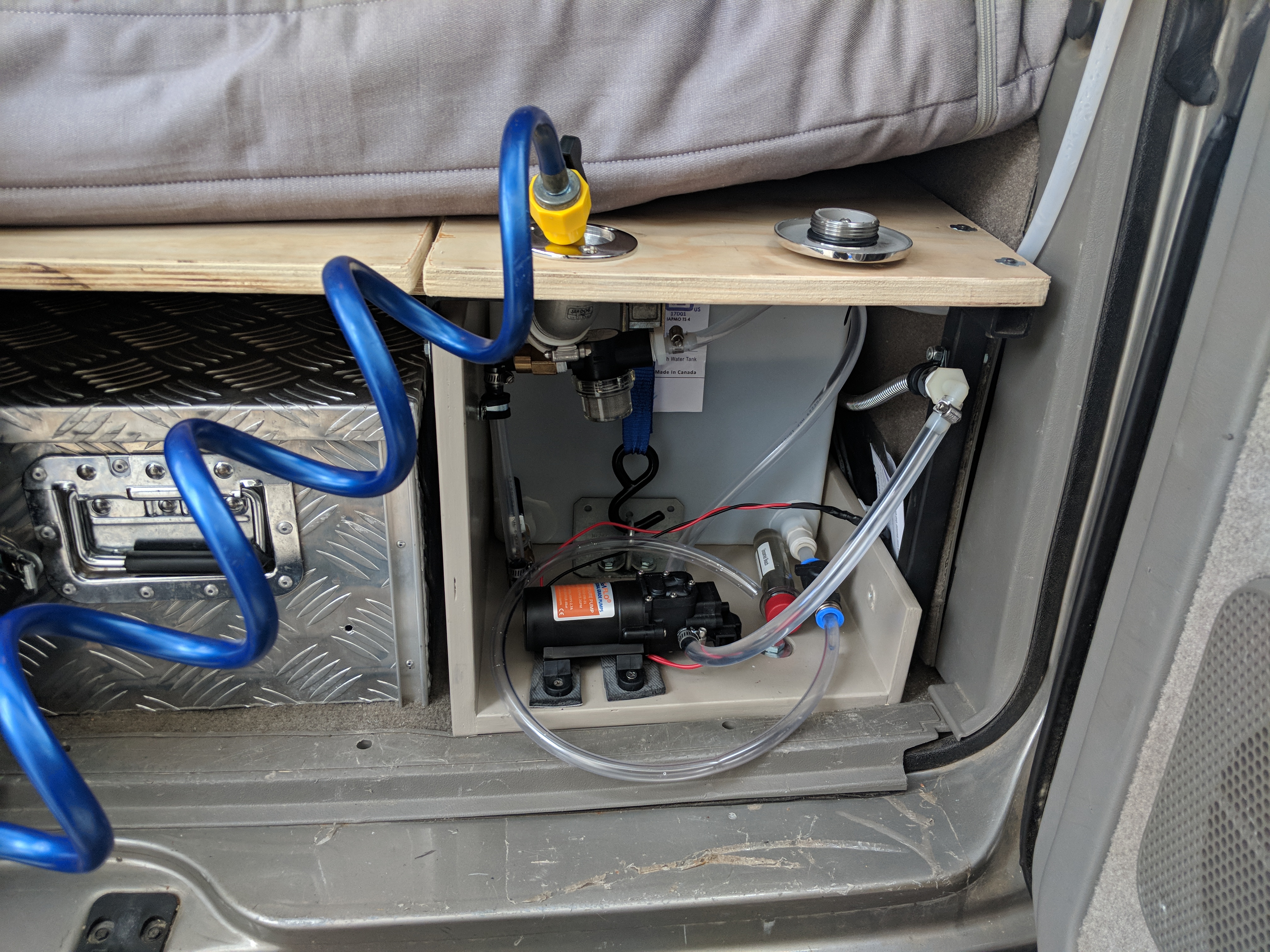 Shurflo inline strainer that helps keep any crud out of the water pump. The drain line normally just coils up into that space, but is long enough to let me drain the tank past the bumper when needed. (It also doubles as a backup to let me gravity-feed water from the tank if the pump ever fails.)