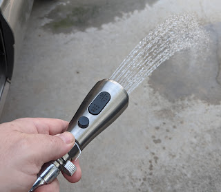 For the sprayer, I wanted something compact and simple, but I did not want one of the ubiquitous plastic hand sprayers that requires holding down a lever to keep water flowing. Therefore, I combined