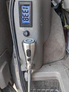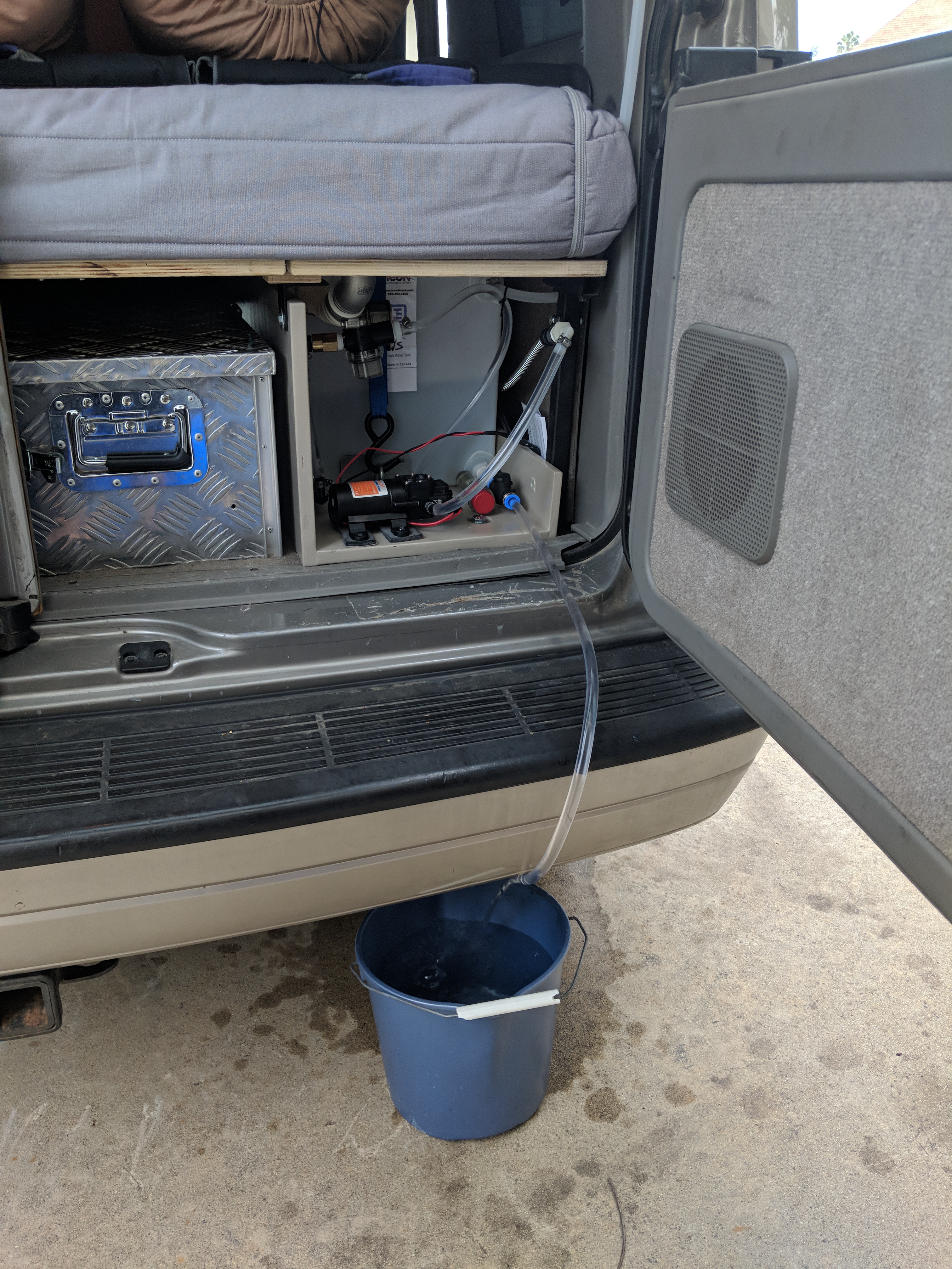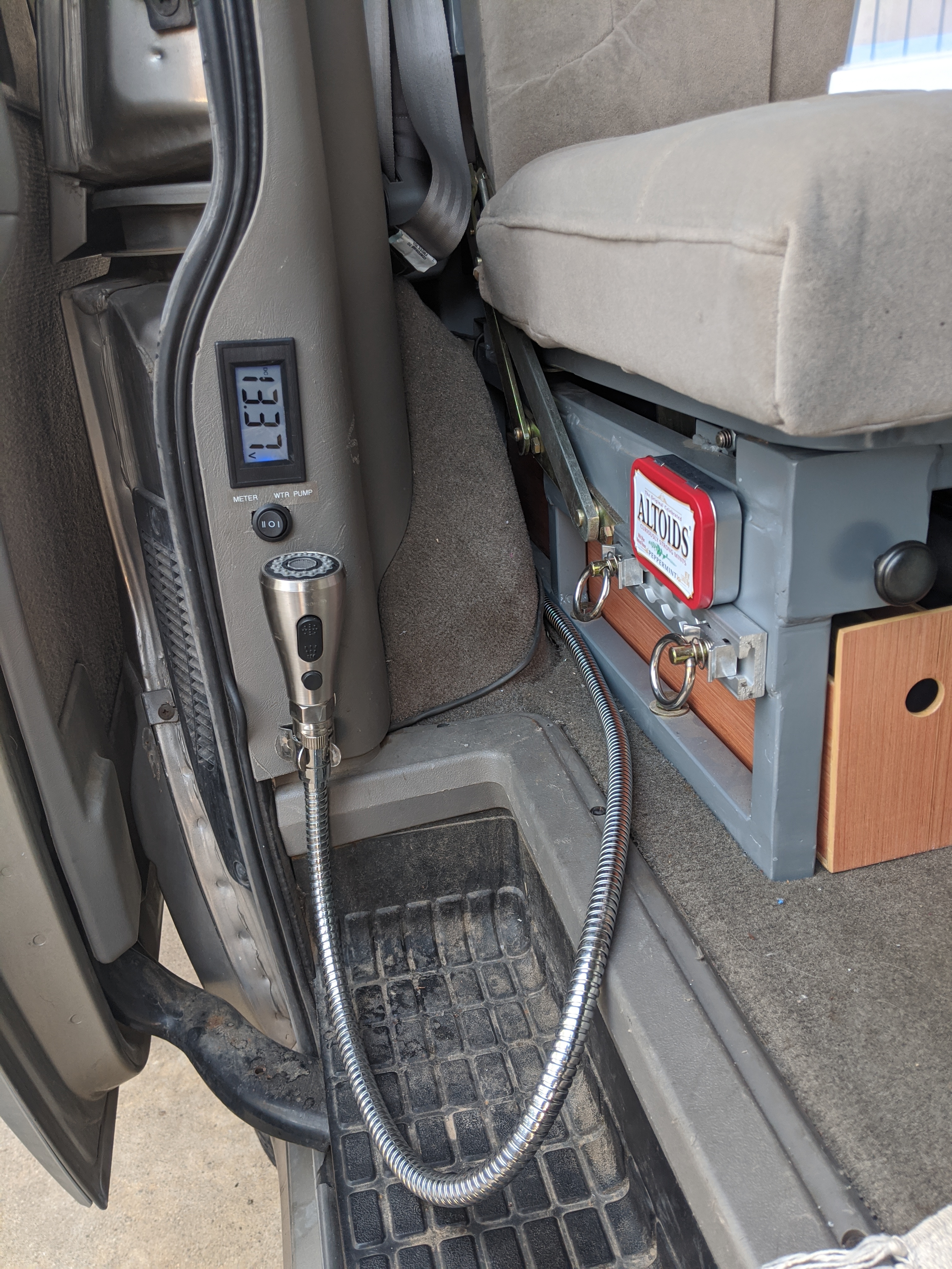 Having the deck fill right at the back door makes filling the water tank a snap - no more climbing into the back of the van to slide the fill tube under the bench seat! I can just slide the mattress forward a bit, unscrew the cap, and insert the water-fill nozzle. On the right hand side, you can also see the vent line that runs up through the D-pillar trim plastic. Water sloshes a bit when we're off-road, so I wanted the exit of the vent line high enough we never have to worry about spill-out. This was occasionally a problem with a short (~6") vent line on the old tank system.