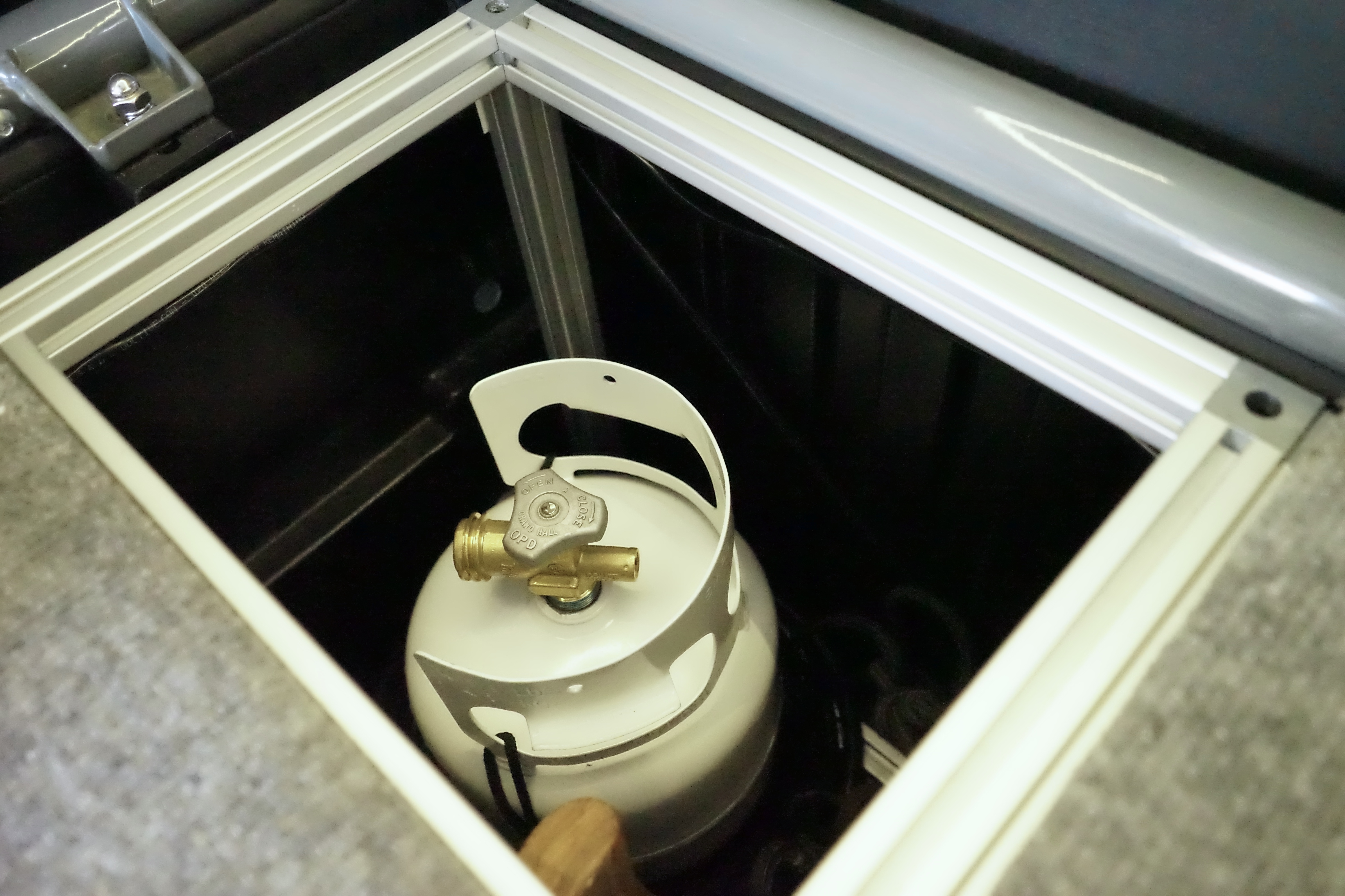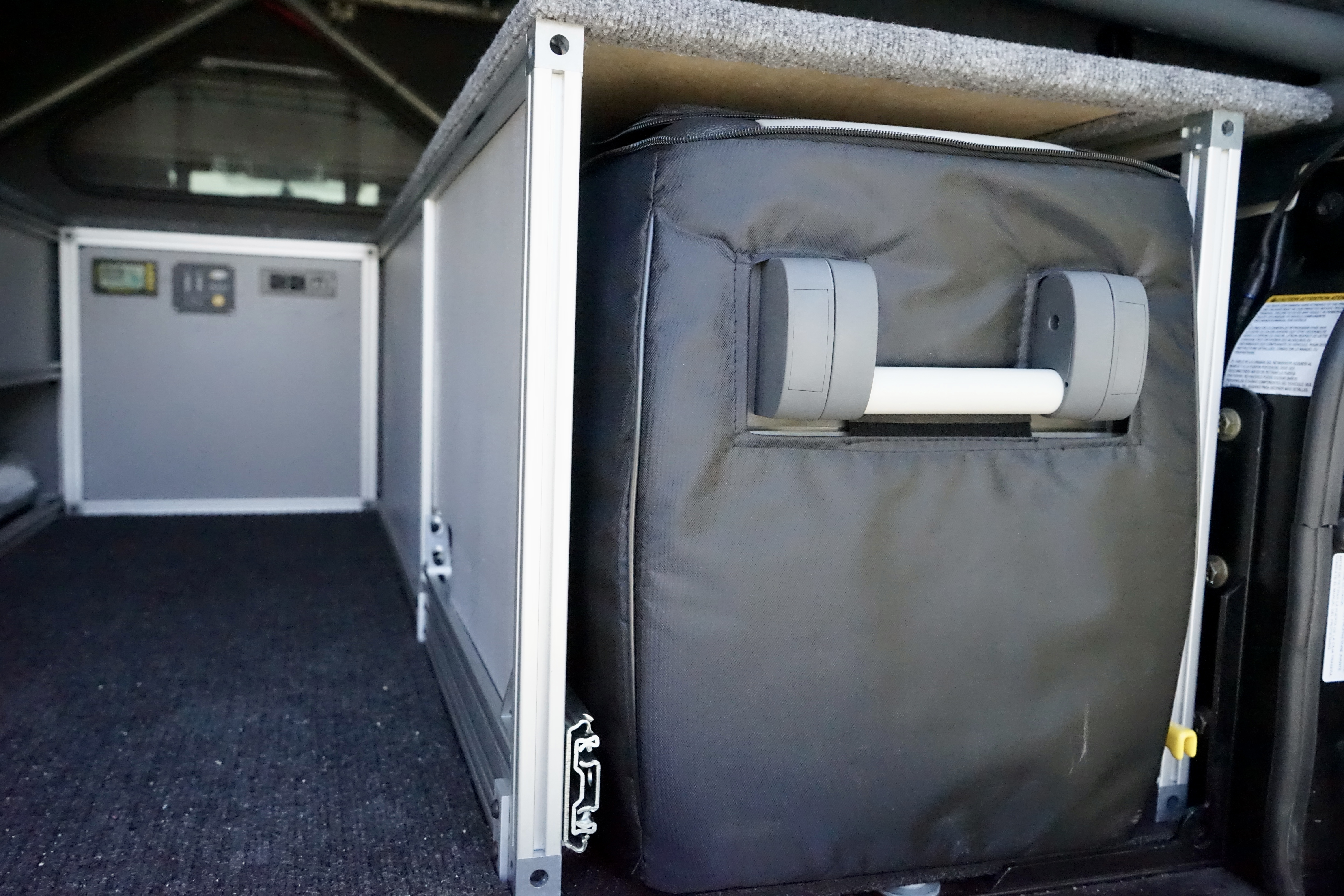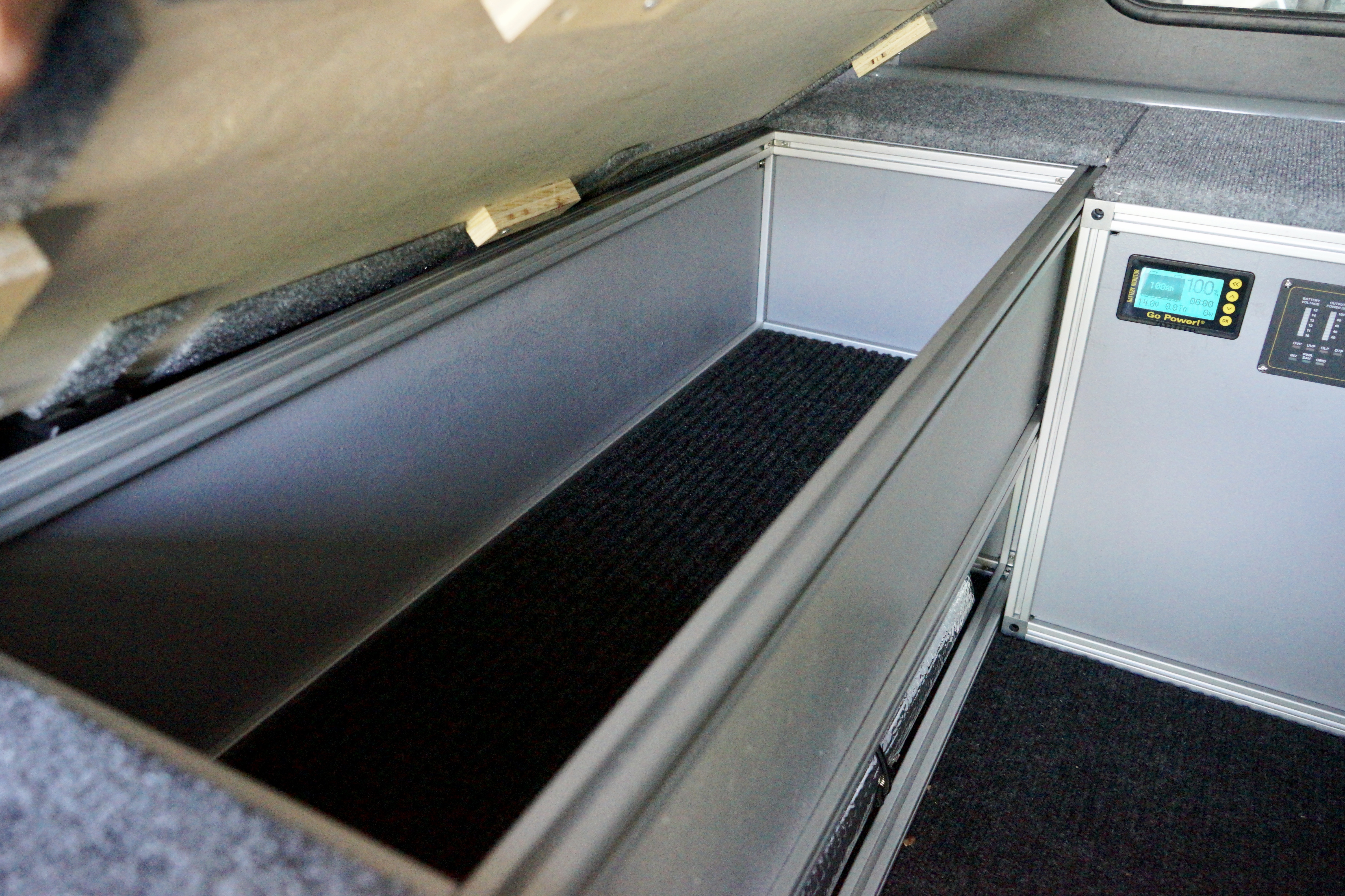 Storage containers for clothes, food, equipment, fridge cabinet, stove and water jug slot, etc. To buy the most similar Goose Gear version of this design would cost $4500 for just the cabinets, and the solar equipment would cost another $3500, not including installation.