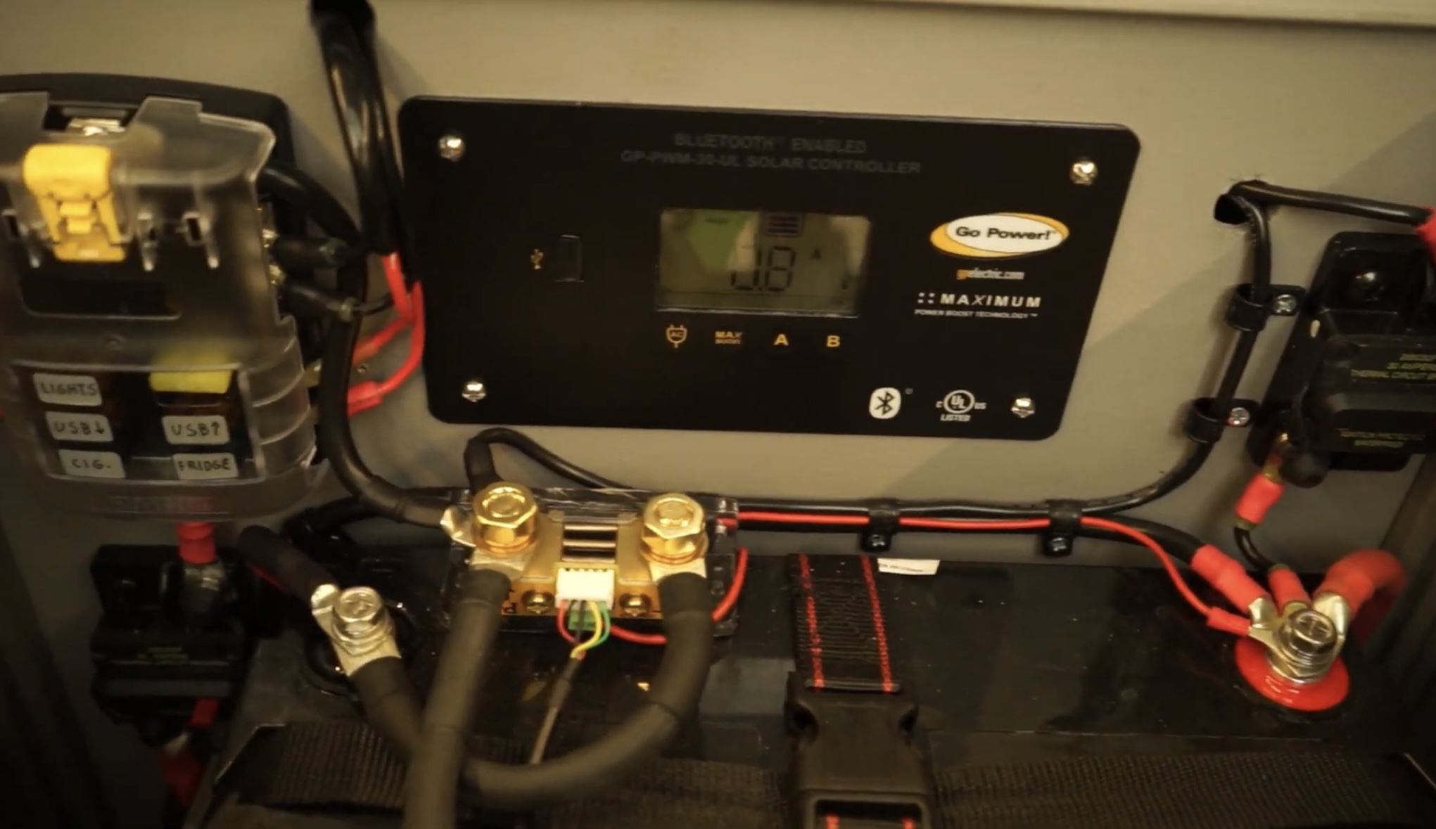 Solar charging setup with 100aH Lithium battery, marine grade fuses, waterproof connectors, in-line marine fuses, hidden wiring, ACDC inverter, multiple usb and 120v outlets, wiring for a 12v fridge, computer charging etc.