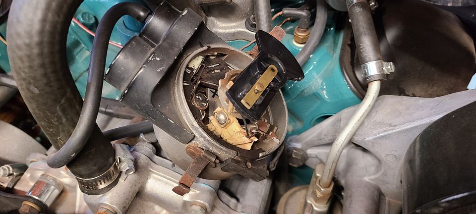 The original distributor. It blew up. Literally grenaded inside the cap. I know...many of you told me not to waste time with the original distributor, and you were right. Instead of wasting any more time with this one, I decide it was time to swap in an HEI ignition. I wanted a DUI brand HEI, but they were eight weeks out for delivery. Summit racing had their brand in stock, and at less than half the price. Guess which one I bought.