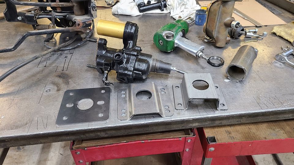 With the Advanced Adapters engine mounts tacked in place, I spent some time fiddling with the hydro boost setup from Power Brake Sales in Sacramento. The stock pedal assembly was modified by cutting off the original mounting flanges and welding on a solid 1/4" plate with holes that match the hydro boost bracket from WFO. You will see three different hydro boost brackets in the pic below, but to get enough room for a pushrod to the pedal, the entire hydro boost unit had to be spaced out from the firewall as much as possible, at least an inch and a half. The holes in the firewall were then welded up and new holes drilled and the unit was mocked up for fitment.