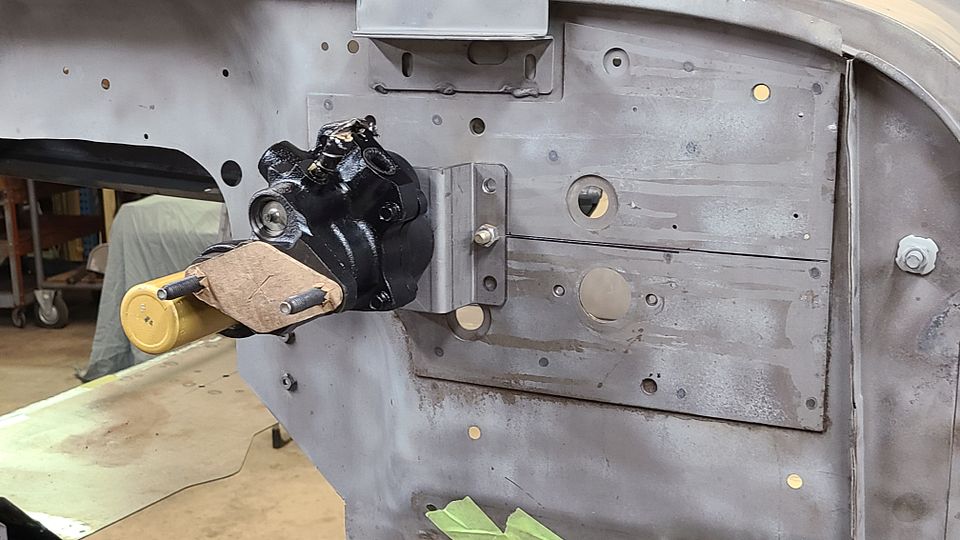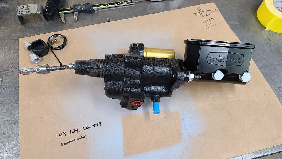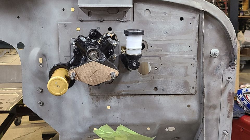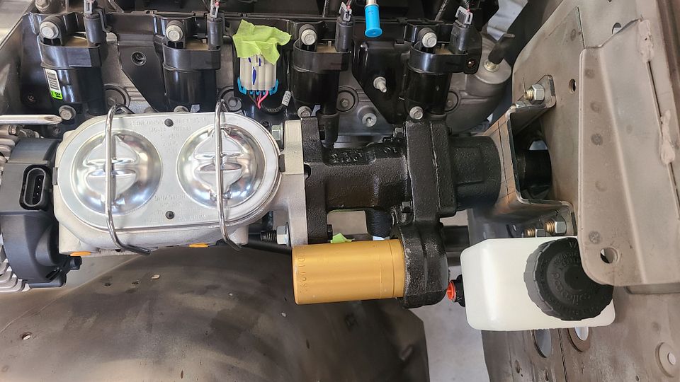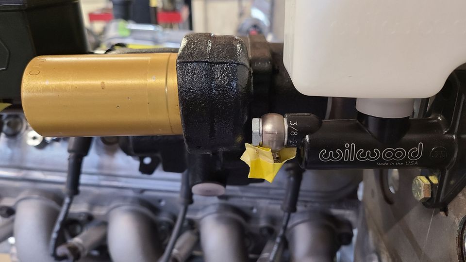These hydro boost units don't car which way they are oriented, which is good, because to gain clearance at the valve cover, I ended up rotating the unit 180 degrees from what you see in the first pics. Great, now with that figured out, I had to then figure out what I was going to do with the clutch master cylinder. The Jeep master was too large to fit behind the hydro boost, so a new compact Wilwood clutch master was bolted up in the newly cut hole in the firewall. The initial fit was less than optimal, with the oulet port on the clutch master running into the back of the hydro boost unit. But before that could be addressed, I put the body back on the chassis to check how the masters fit against the engine. And then I discovered that the aluminum Corvette master cylinder actually hit the back of the alternator. Ughhhh. Back to the computer and research began for a smaller brake master, which ended up being supplied by Wilwood, this time in a compact tandem unit, which was almost an inch and a half shorter than the Corvette unit. So with a little wiggle room between the alternator and master, I spaced the hydro boost unit further away from the firewall and used a banjo bolt on the outet of the clutch master. This whole scenario was just the beginning of the fitment issues in that area of the body and chassis.