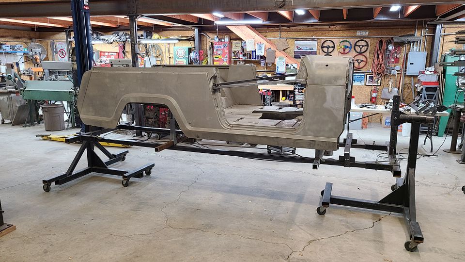 The body was blasted and mounted up on our rotisserie to get ready for rust repair. Plenty of measurements were taken before anything was cut. Then, using some repair panels from Jeepster Man, the surgery began. Note that some of the panels were formed here in the shop. I originally felt that the rocker panels weer in good enough shape to be able to patch them, but in the end, I replaced so much of them that I should have just bought new rocker panels. You will also see how the inner rocker panel was modified to be stronger than stock.