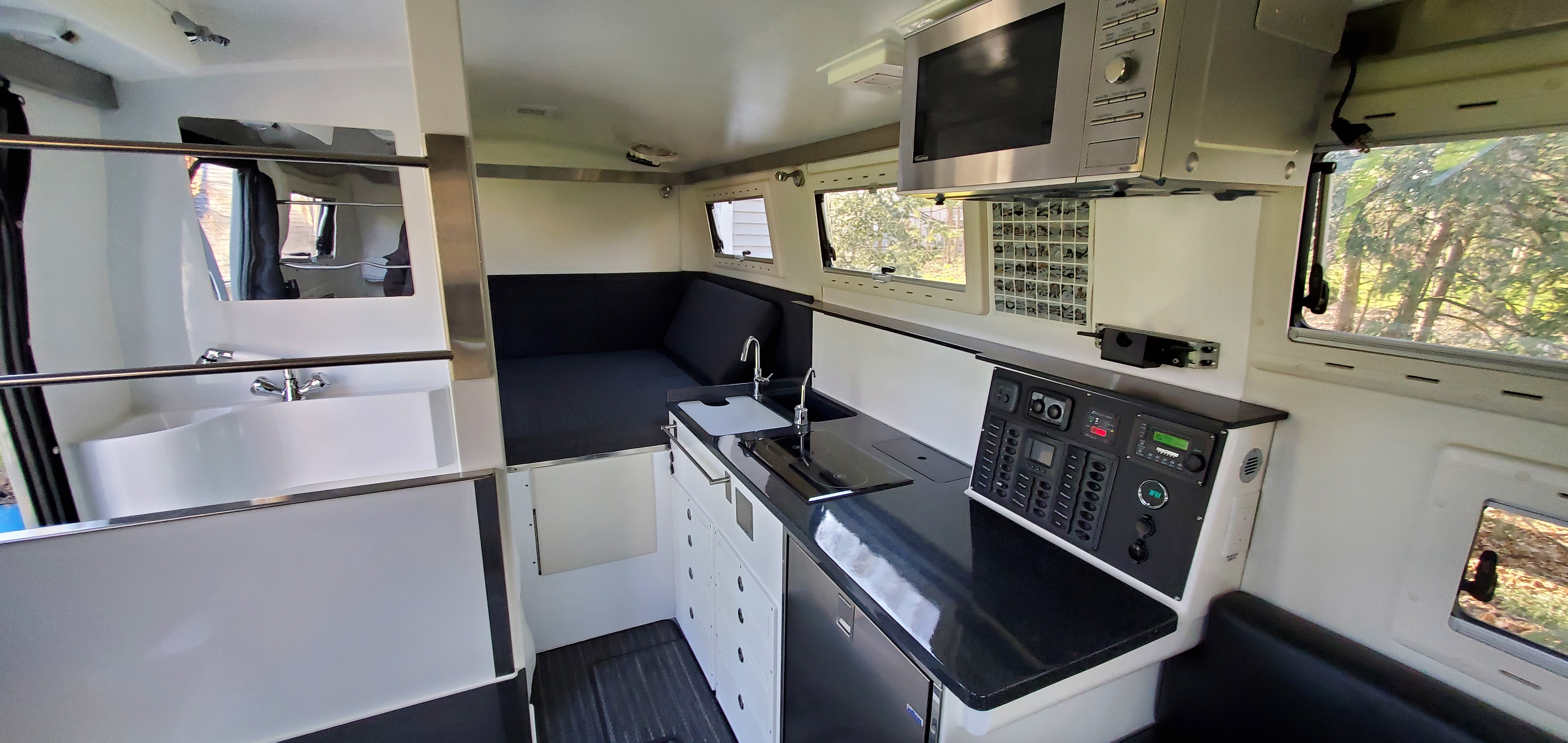 The kitchenette is equipped with composite countertops, an Isotherm refrigerator/freezer, a double-basin sink, a Webasto diesel cooktop, and a ceiling-mounted Panasonic microwave oven.