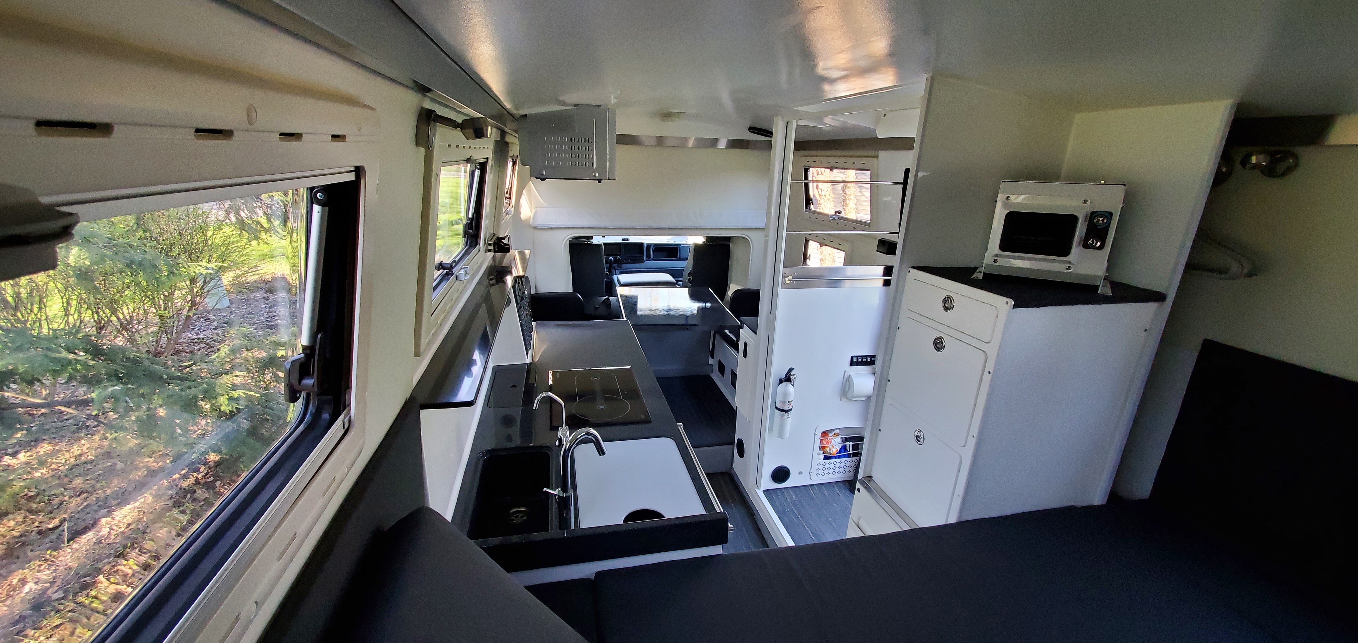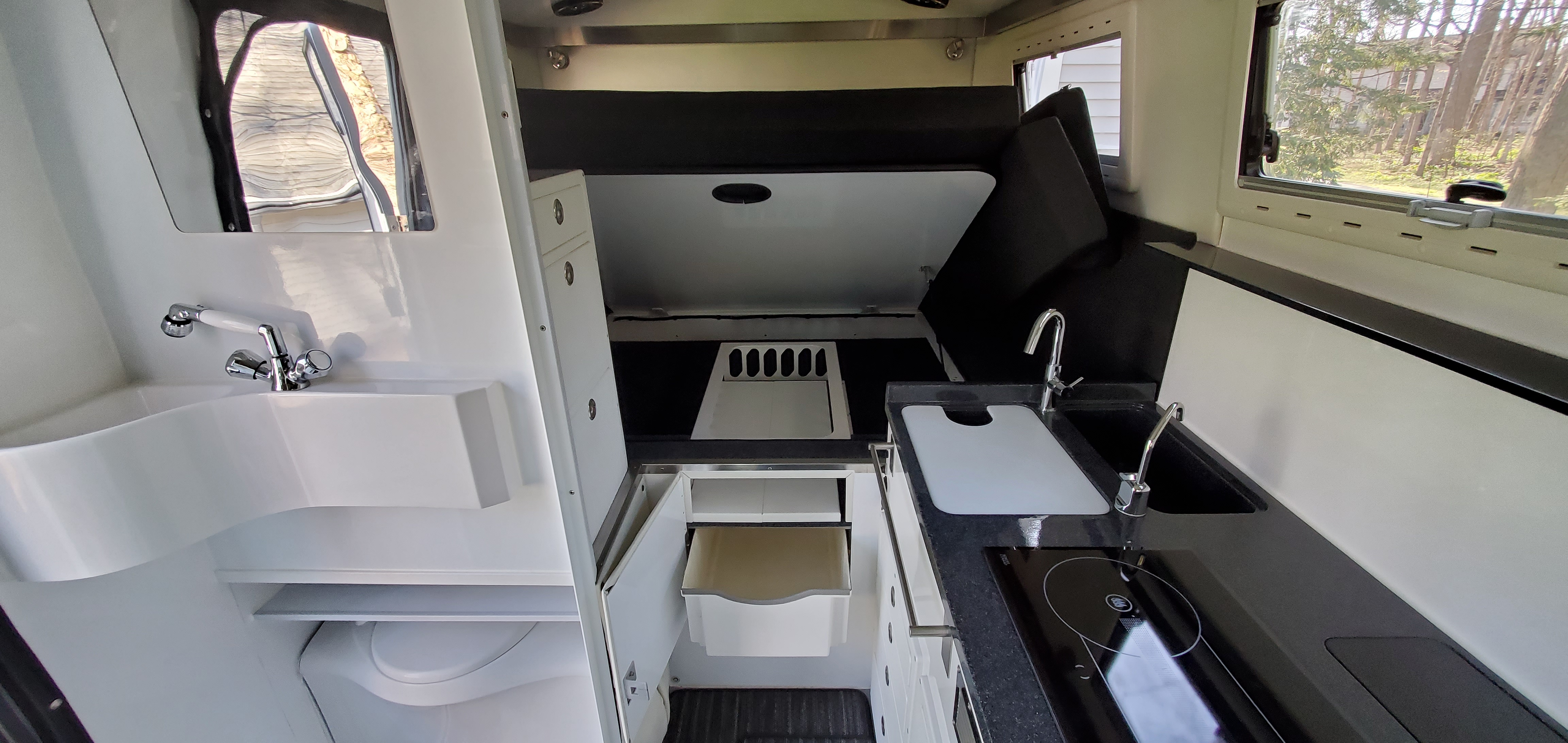 Climate control gear consists of a diesel Webasto air/water heater, an Arctic Breeze DC air conditioner, and ceiling-mounted fans. A MagnaSine inverter/charger is provided for the 110V outlets and USBs located throughout the camper.