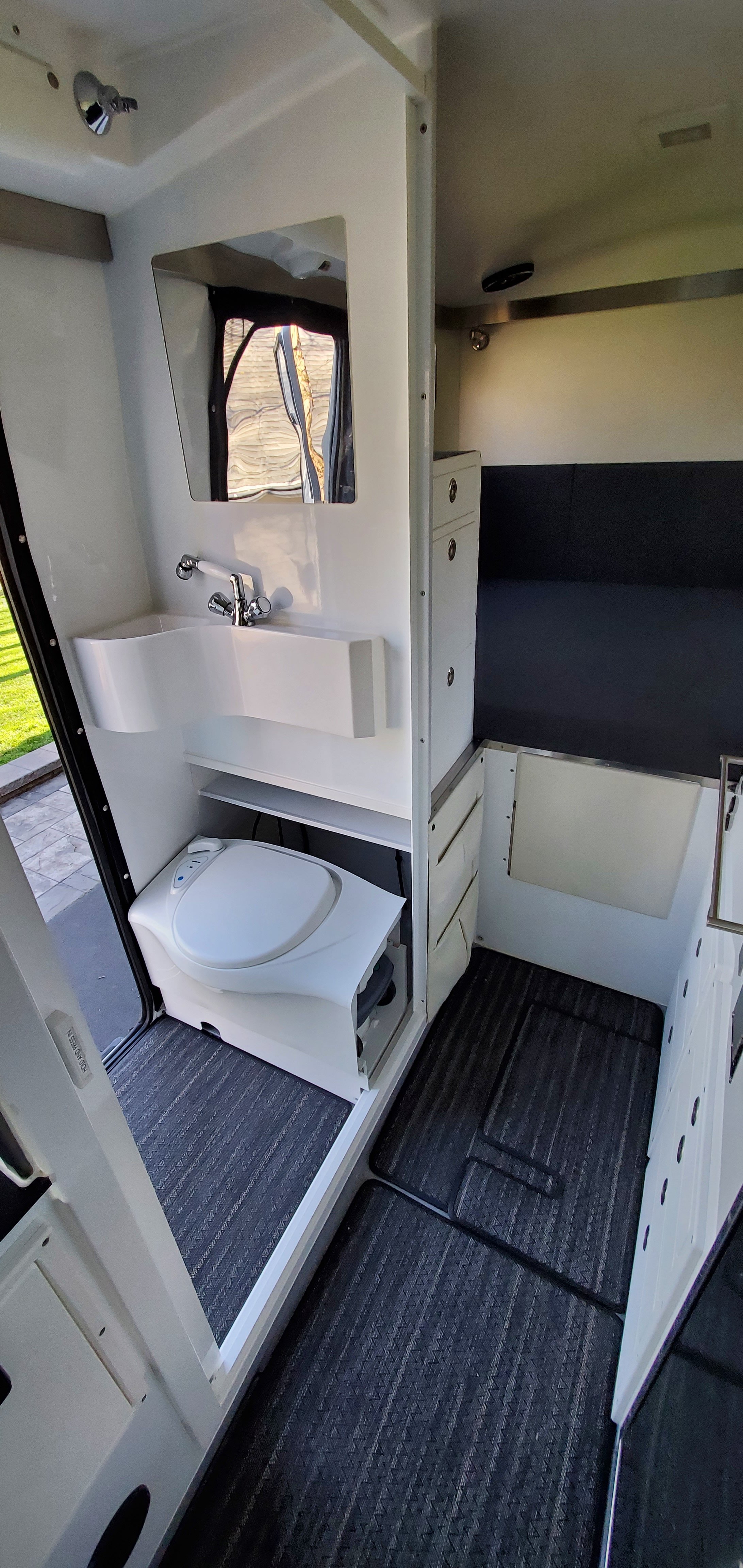 A shower, sink, and retractable Thetford cassette toilet are located in the entry vestibule.