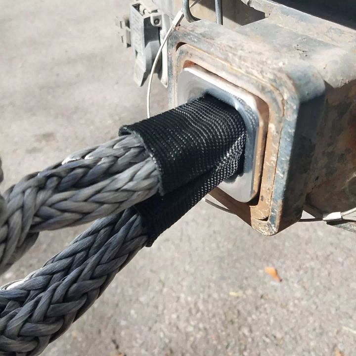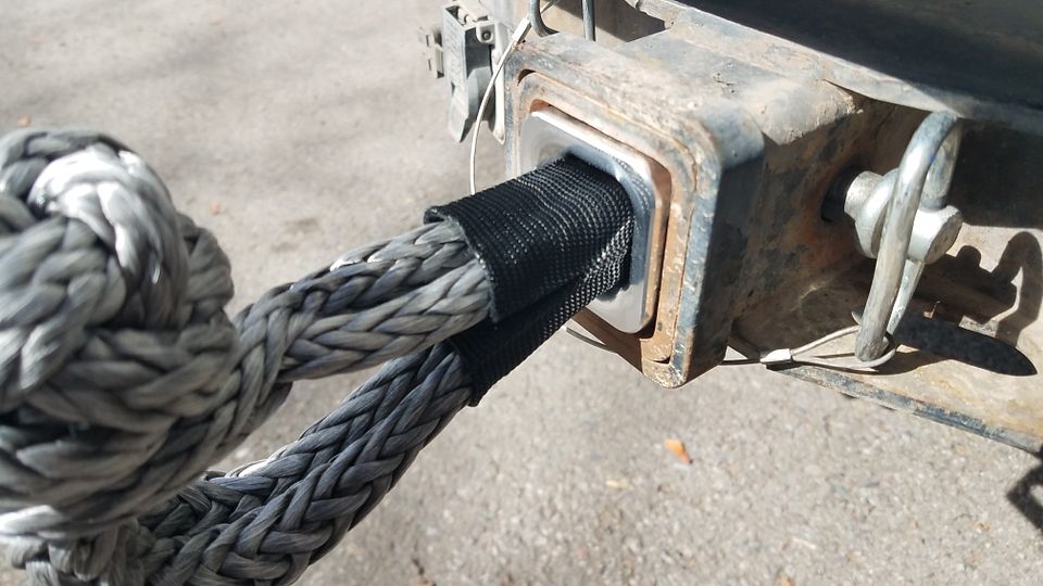 The aluminum adapter provides a full 1" working diameter for the soft shackle that provides proper support for the normal 5/8" trailer hitch pin. A gentle 1/4" radius on each side of that 1" tubular cross-member helps prevent any high load crack propagation in the corners while also providing additional support for the soft shackle line diameter. The throat has a large 3/8" radius around the full opening to allow for pulling at up to 90 degrees in any direction without the need for any re-rigging. Vehicle recovery is rarely in a straight line.