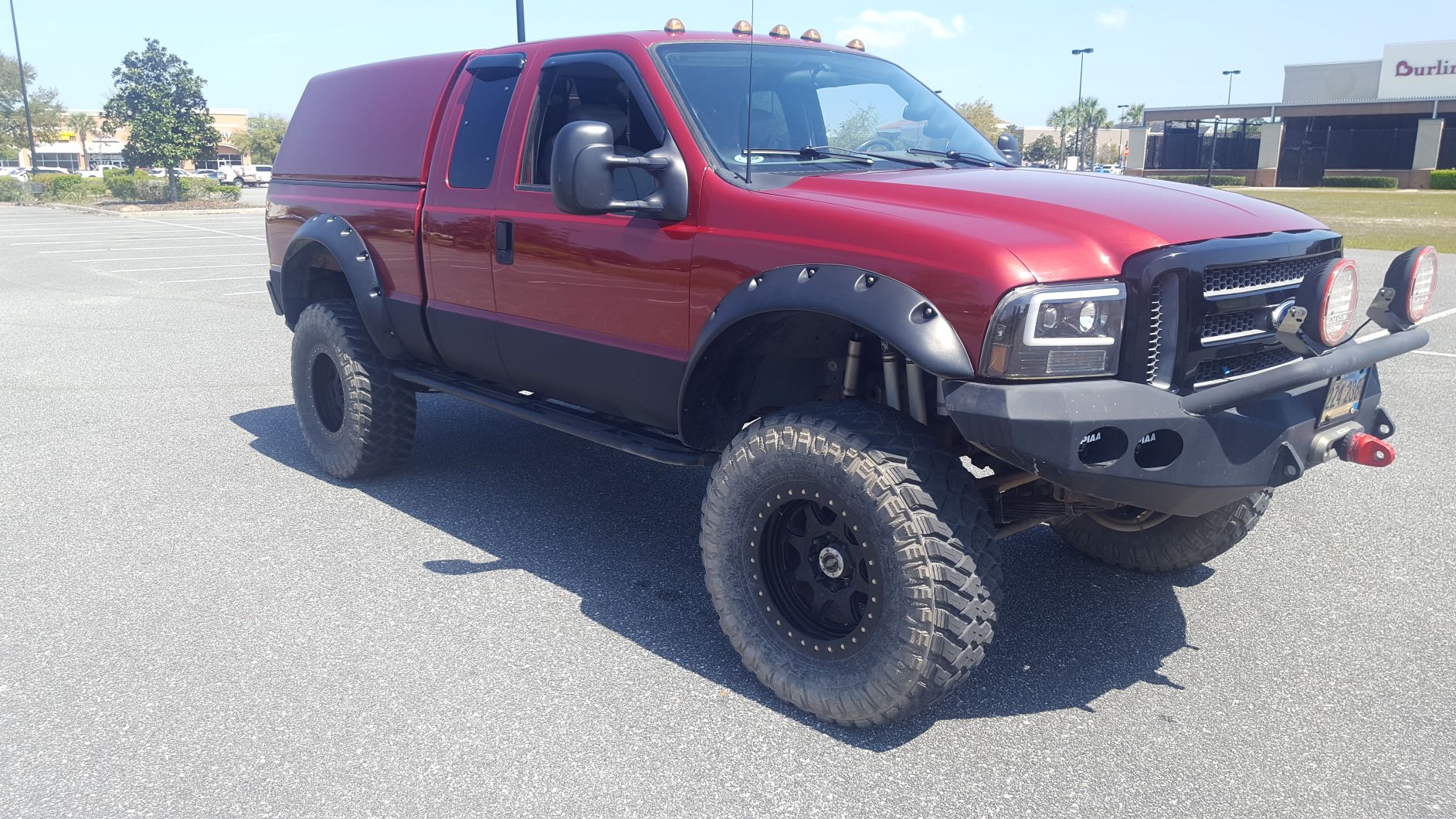 Custom-made rock sliders welded to the frame. Bushwacker cut-out flares. 2007 front grille. Line-X sprayed in bed and on the lower portion of the exterior body panels.
