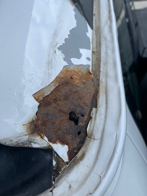 Roof where the Pop Top seal rubbed through the paint and moisture was trapped under the rub protection tape. (See pics). These roof rust areas were not readily visible before pulling up the tape. Once the tape was pulled up it was apparent that this was going need substantial repair. The tape residue line can be seen in the pics. There are a few blister spots on the Driver side of the van near the Aluminess ladder. There is an area at the lower Driver to Fender area that shows surface discoloration and rust.