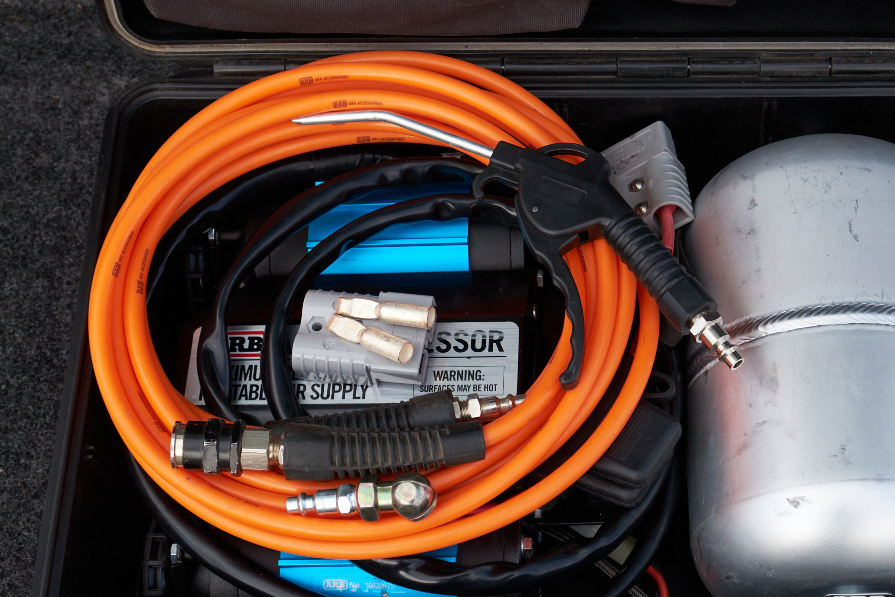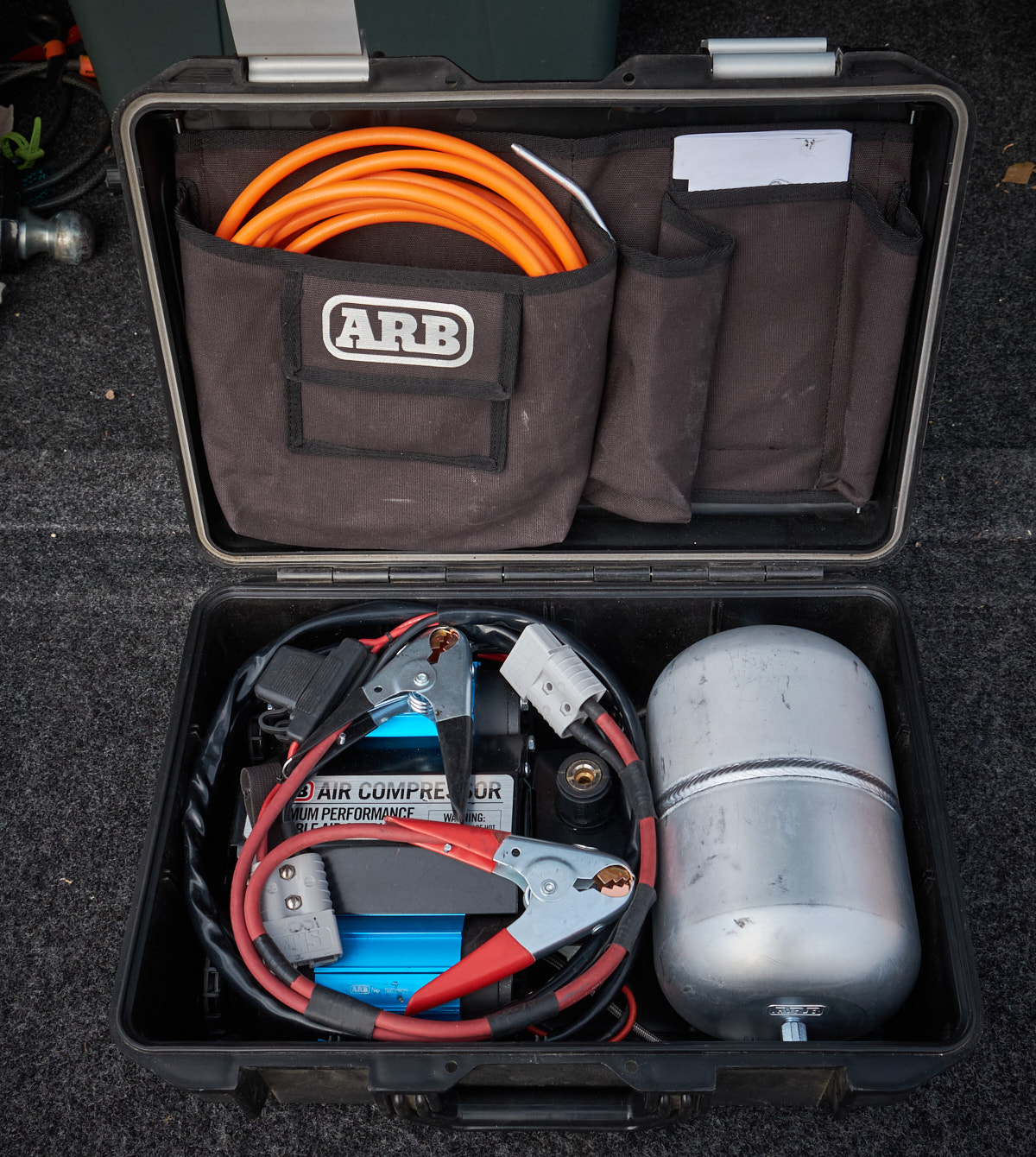 Fantastic ARB compressor in a bag.. 'er I mean case that is akin to a Pelican. Will inflate a 35" tire from flat to 40psi in 1 minute and change. Will run an impact gun. Easily reseat a bead. I have used it for those things listed. The power cable has been modified with an SMH / Anderson type connector. I had a setup with the mate to the compressor connector mounted on my ARB bumper so all I had to do was plug into the connector and not even open the hood. Also a set of really heavy duty clamps with the same connector so the compressor could be used in a conventional manner. Included is an extra unused connector should you want to go the same route with a remote connection to the battery. I swapped out the air chuck as I found the OEM not as friendly as conventional chuck.