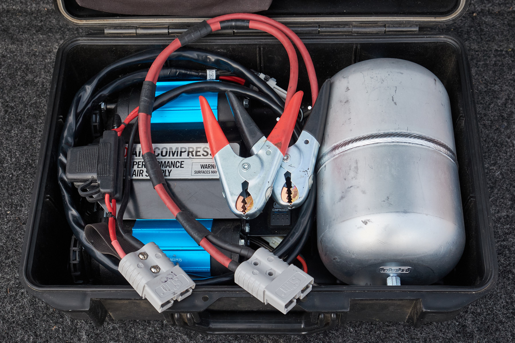 Fantastic ARB compressor in a bag.. 'er I mean case that is akin to a Pelican. Will inflate a 35" tire from flat to 40psi in 1 minute and change. Will run an impact gun. Easily reseat a bead. I have used it for those things listed. The power cable has been modified with an SMH / Anderson type connector. I had a setup with the mate to the compressor connector mounted on my ARB bumper so all I had to do was plug into the connector and not even open the hood. Also a set of really heavy duty clamps with the same connector so the compressor could be used in a conventional manner. Included is an extra unused connector should you want to go the same route with a remote connection to the battery. I swapped out the air chuck as I found the OEM not as friendly as conventional chuck.