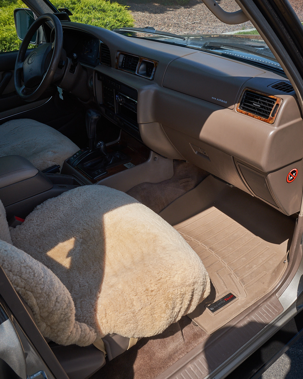 Front seat leather is pretty worn but unnoticeable due to the REAL sheepskins