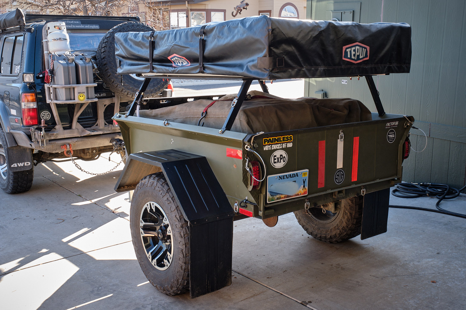After much agonizing and hand-wringing.. we have decided that our great little trailer needs to collect some dollars and explore someone else. It is an extremely well built 820 lb military knock-off. Fully loaded as we use it.. right around 1200 lbs. The roof top tent is a brand new Tepui Ruggedized Kukenam 4. So a king-sized bed and mondo room. A bit heavy of a tent for an adventure vehicle roof in my opinion.. but perfect letting the trailer take the weight. Plus the entry to the tent is only 55" off the ground. Every zipper has a Maxpedition Large Zipper Pull installed. Includes two rain flys. Aluminized version which really works great to lower the inside temp and the original. Also we purchased the full coverage Weatherhood. Sad part for us tho' and a bonus for the next owner.. we have only slept in the tent twice and never on the mattress that came with it. We used an Autana 3 and needed more room so we picked the Kukenam up at Tepui in Aptos in January 2020. Well there was a problem getting out for all of last year. Hence no use and like absolute brand new.