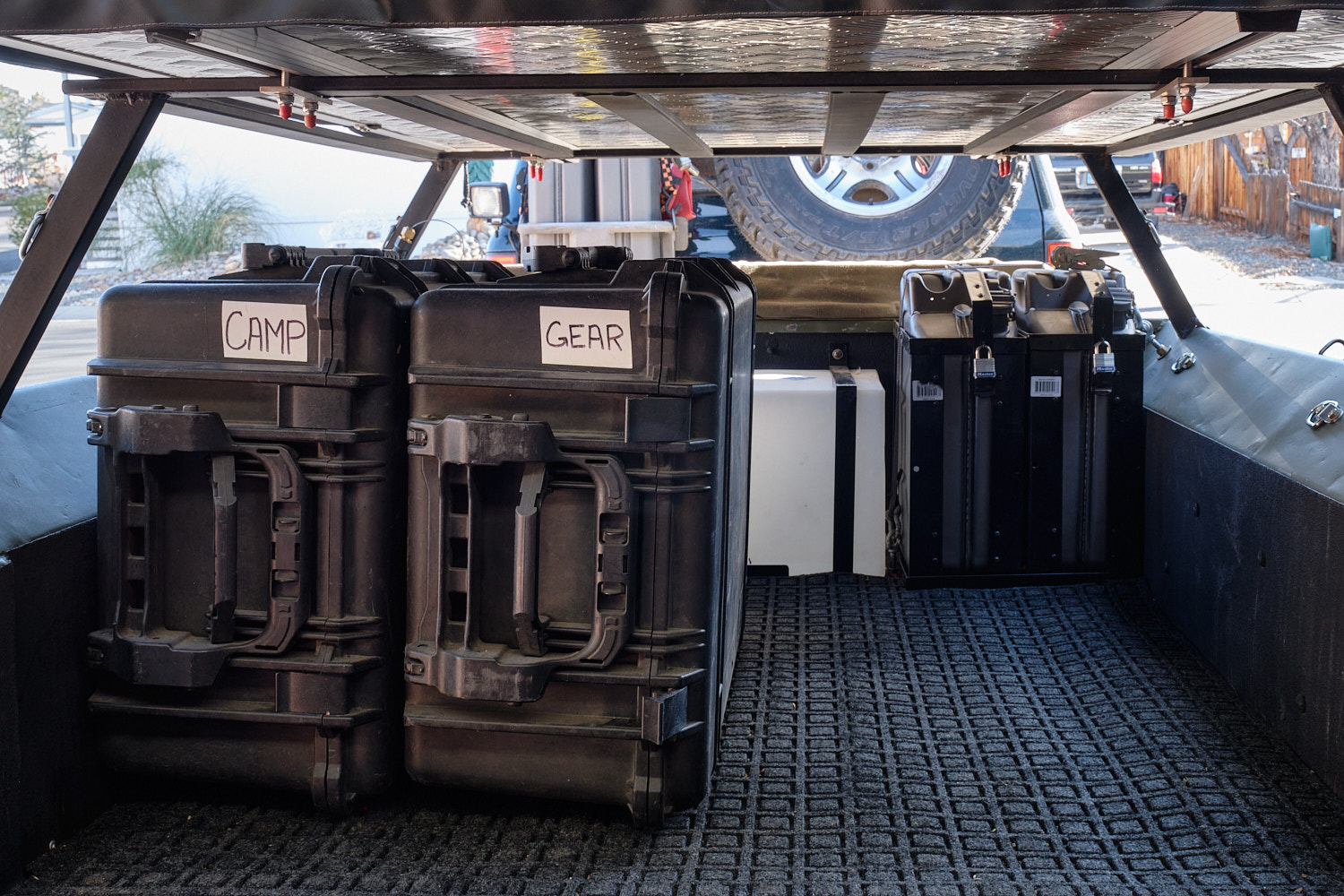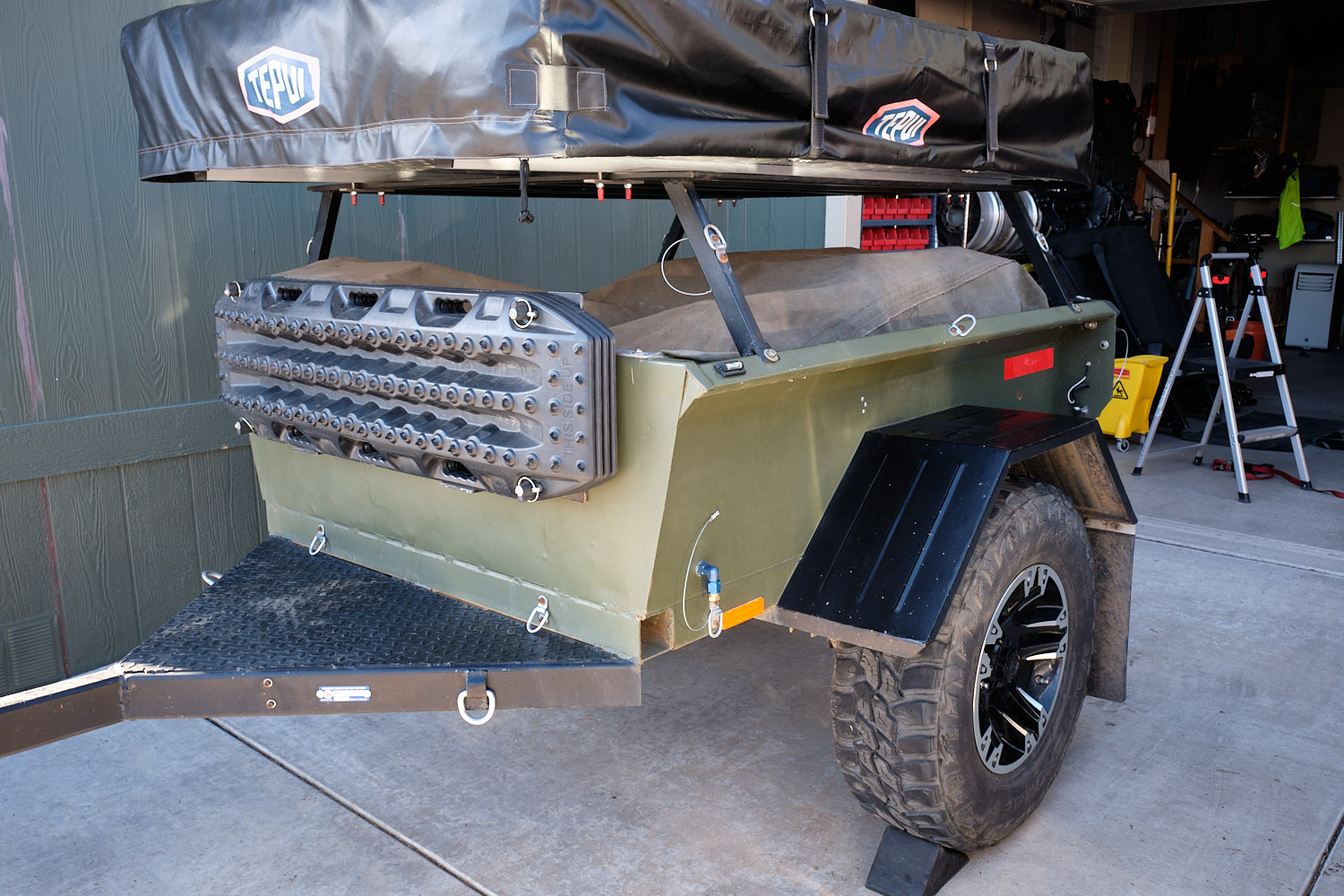 The trailer also has an installed 15 gallon water tank. The water outlet fitting is a swivel AN fitting. We have about a 6' hose to attach and gravity works great. Additional we have a 3 gallon shower tank in one of the Pelican cases. Two 20L Nato fuel can carriers. Maxtrax carrier utilizing Maxtrax lockable mounting pins. Two Pelican 1650 cases and an 11 lb propane tank. To make off-road towing perfect there is a Lock n' Roll hitch. There is no lid on the trailer. However I devised mounting a canvas tarp that works excellent. No water or dust in any appreciable amount gets in. There is a rear 2" receiver that holds a support when the trailer is used unhitched. Tires are in good shape. Rims are 5 lug Jeep pattern. Leaf sprung with shocks. Within the last 1,000 miles I replaced the wheel bearings and seals. Axle specs out to 2,500 lb version.
