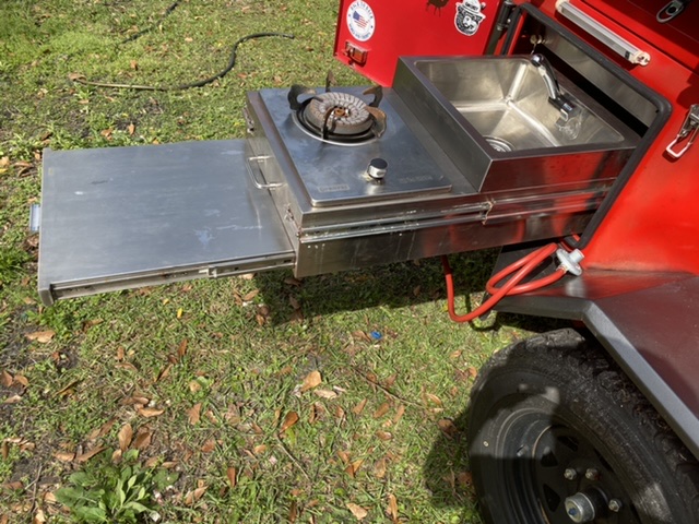 For sale: custom built light weight off-road trailer. ...1140 lbs with off-road trailer hitch coupler. Built in 1 burner stove on drawer system with 5’ propane hose attached. 9”x 9” sink with working faucet also located on same drawer slide out. 39”x 34” storage compartment with 2 access hatches. The roof with tent opens on hinges with assistance from 2 gas shocks. 10 gallon stainless steel water tank plumbed to sink. Alu-Cab roof top tent on the top mounted on 3 Thule bars. Tongue box on front of trailer and Jerry can holder on passenger side. Yellow top Optima battery that runs; lights, sink, USB plug in, and cigarette lighter is Included. Tire size: 235/75R15 with full size spare on swing out tire carrier. The suspension consists of Independent coil spring swing axles with limiting straps that allow amazing articulation and keeps tires on the ground... $9750.00 obo If you have any questions or need additional photos please don’t hesitate to email. $16k invested. Won’t find a better or lighter camper for this price. Located in North Florida but will meet within reasonable distances or ship at buyers expense.