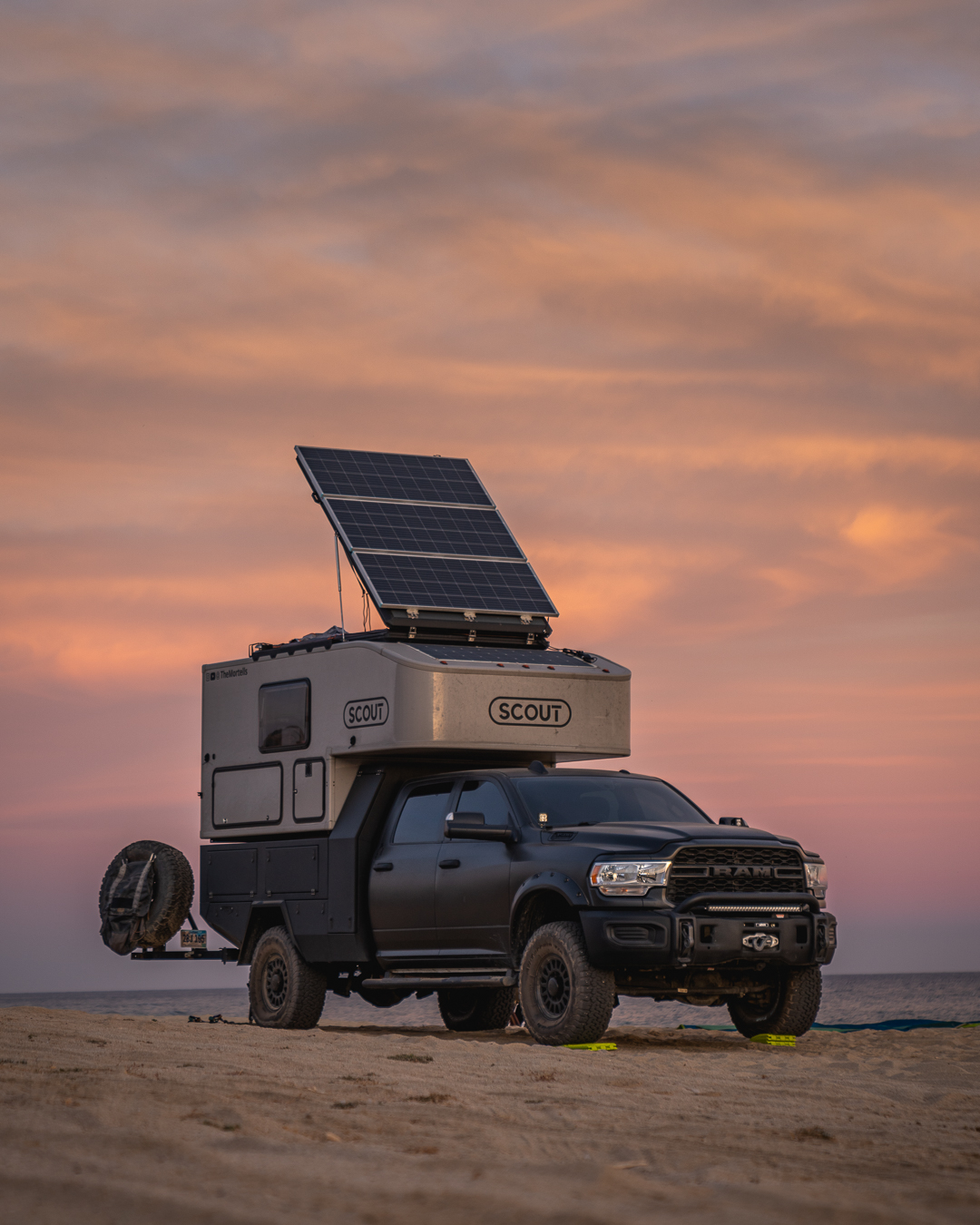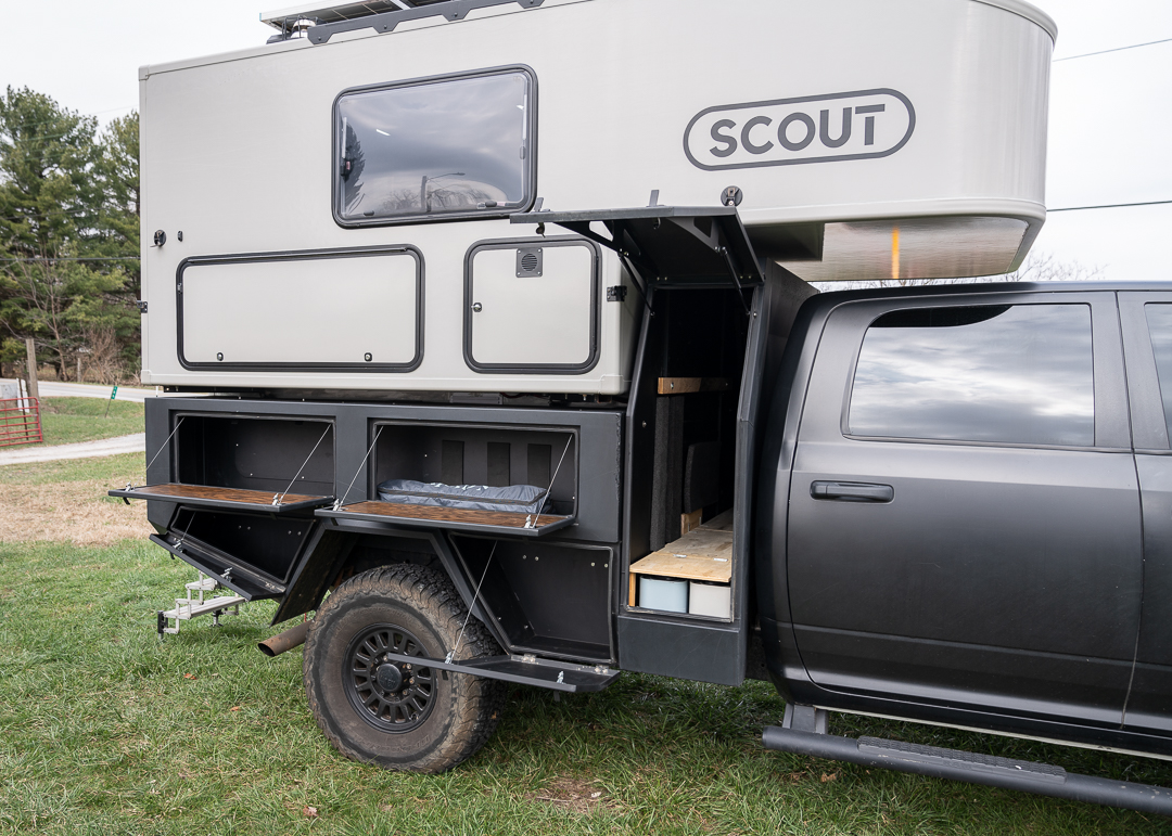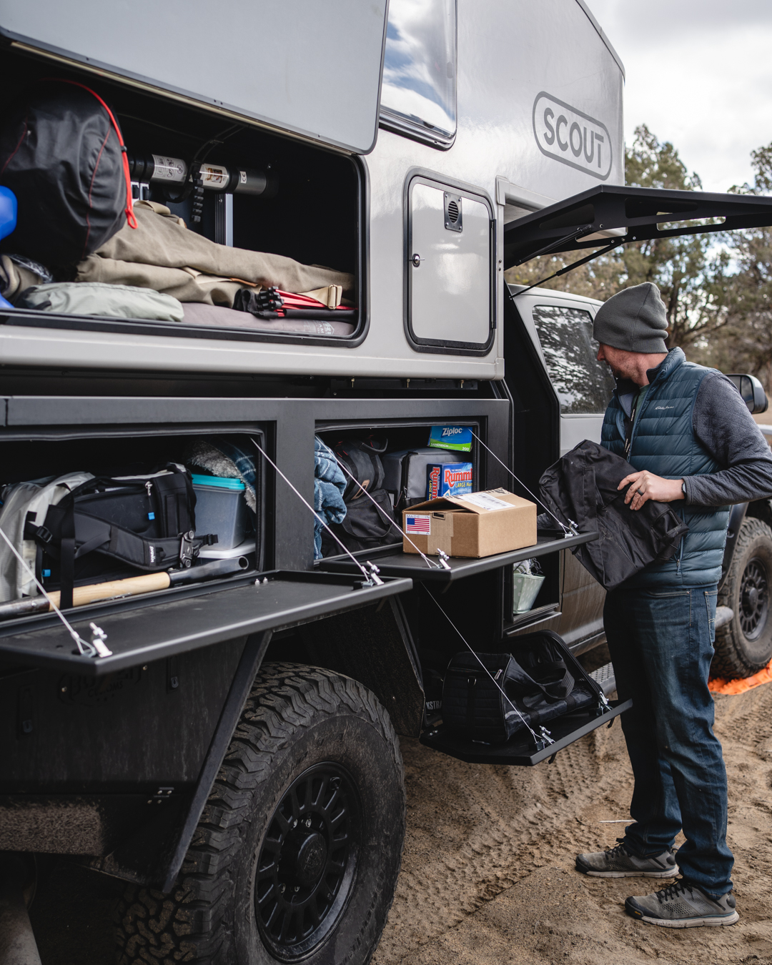 The truck bed is a Bowen Customs Camper Bed with an 18” front garage designed to fit the Scout Kenai perfectly. This bed maintains the height of the stock bed (unlike flatbeds which raise the height of the bed) and adds immense amounts of exterior storage. It enabled us to carry plenty of dog and cat food, 15+ gallons of water, two inflatable paddle boards, two foldable bikes, recovery gear, a pizza grill at one point, and more.
