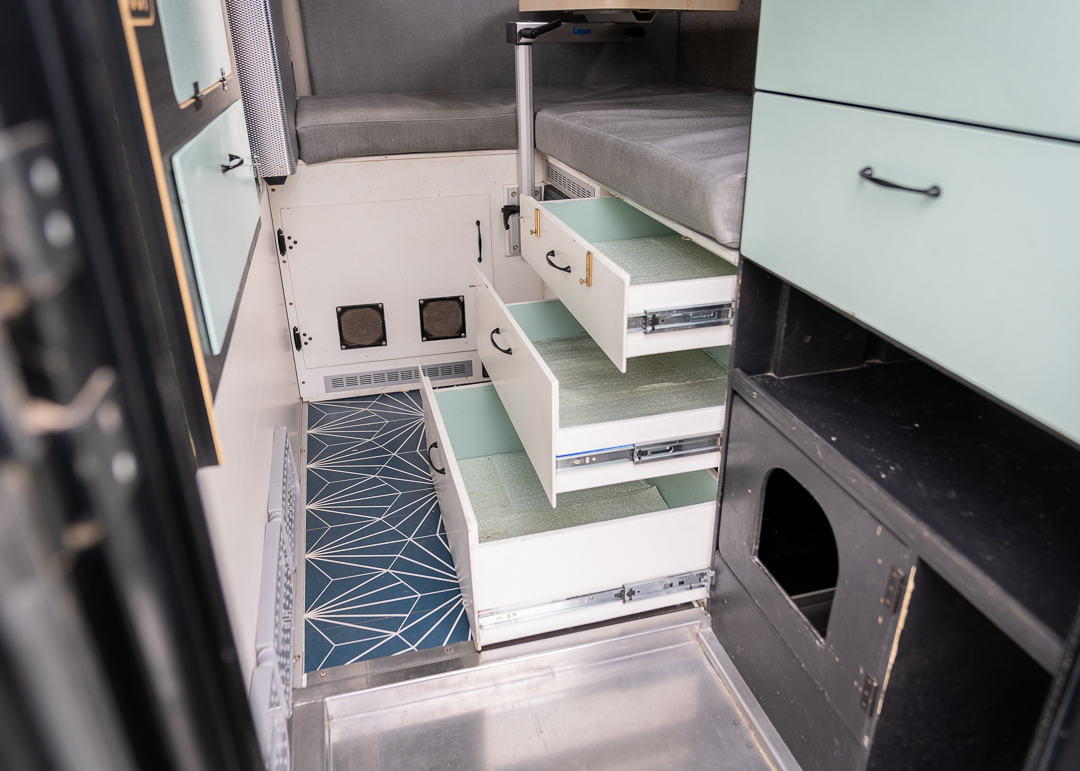 This Scout Kenai camper is one of a kind and has been renovated to optimally suit full-time life on the road. Its substantial 900 amp hour power system supports the AC unit, induction cooktop, large fridge/freezer, Starlink internet (which can be used while driving), and any and all other electronics that you need. The custom-built drawers also create significantly more usable, interior storage space than the standard cubbies typically found in Scout Campers.Camper specs