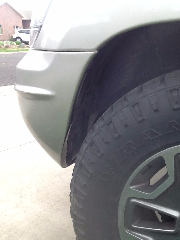 My wife kinda l laughed when I tried to explain everything I did to get a 31" tire with only an upcountry lift to flex into the wheel well. When she looked in the wheel well... she said everything looked normal (like it was stock). Yet I have trimmed about 2inches in the front and and inch in the back. Cut bumpers, reattached the bumper lip with bondo, relocated washer bottle, moved the horns, upgraded to thinner fog lights, trimmed metal, hammered pinch seams and repainted the whole front bumper.